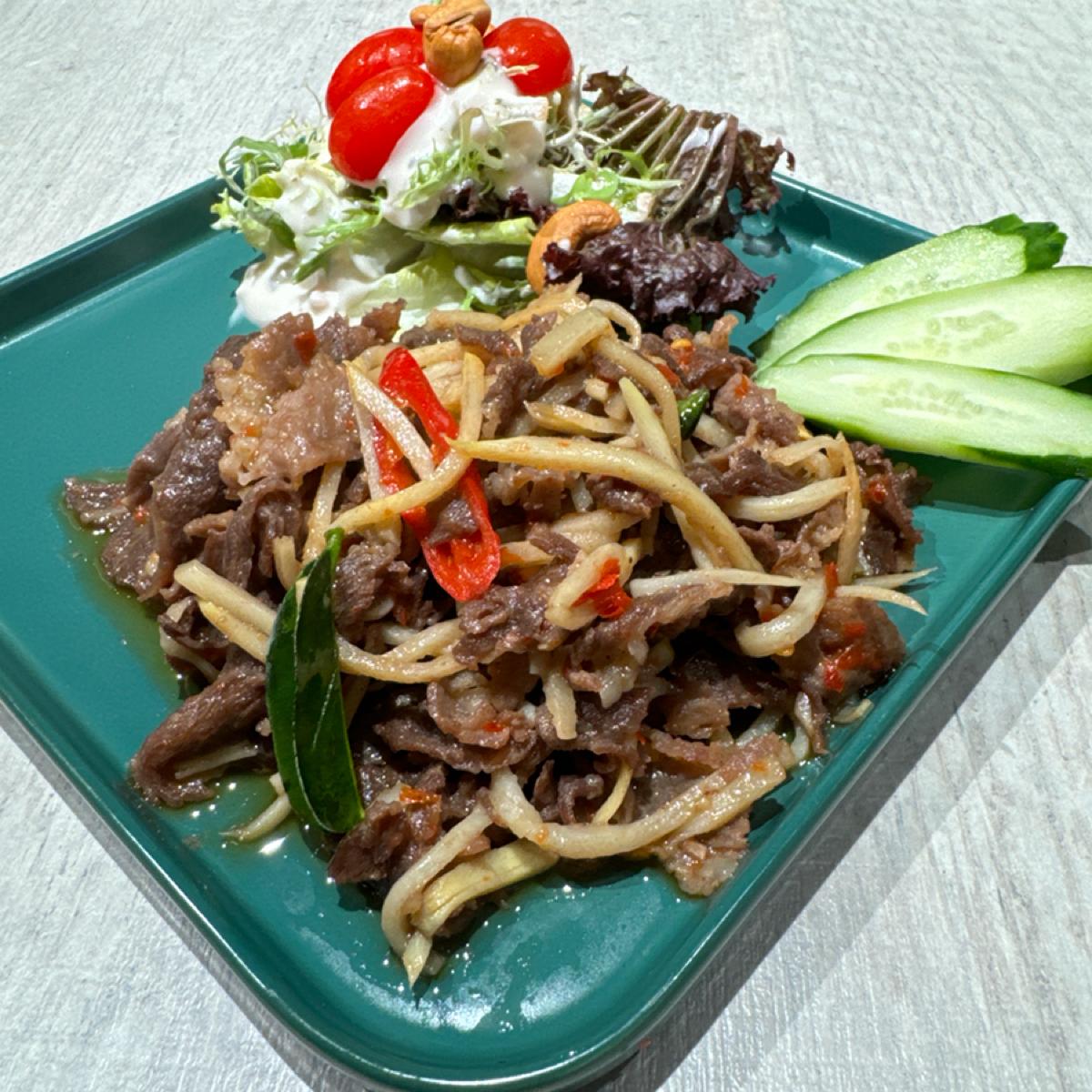 -鮮香辣炒嫩牛-290-份量大約快一人份泰餐的兩倍。旁邊一樣有附沙拉。沙拉上面的醬滿多的,醬滿特別的有南洋酸甜味。牛肉片的部分比較偏瘦薄的火鍋肉片,有點柴。旁邊炒香筍細絲,不過沒什麼脆感。整體滿油的,口味也是偏比較重鹹,辣度感覺只有小辣,香茅味比較明顯,整體南洋味普通,中規中矩