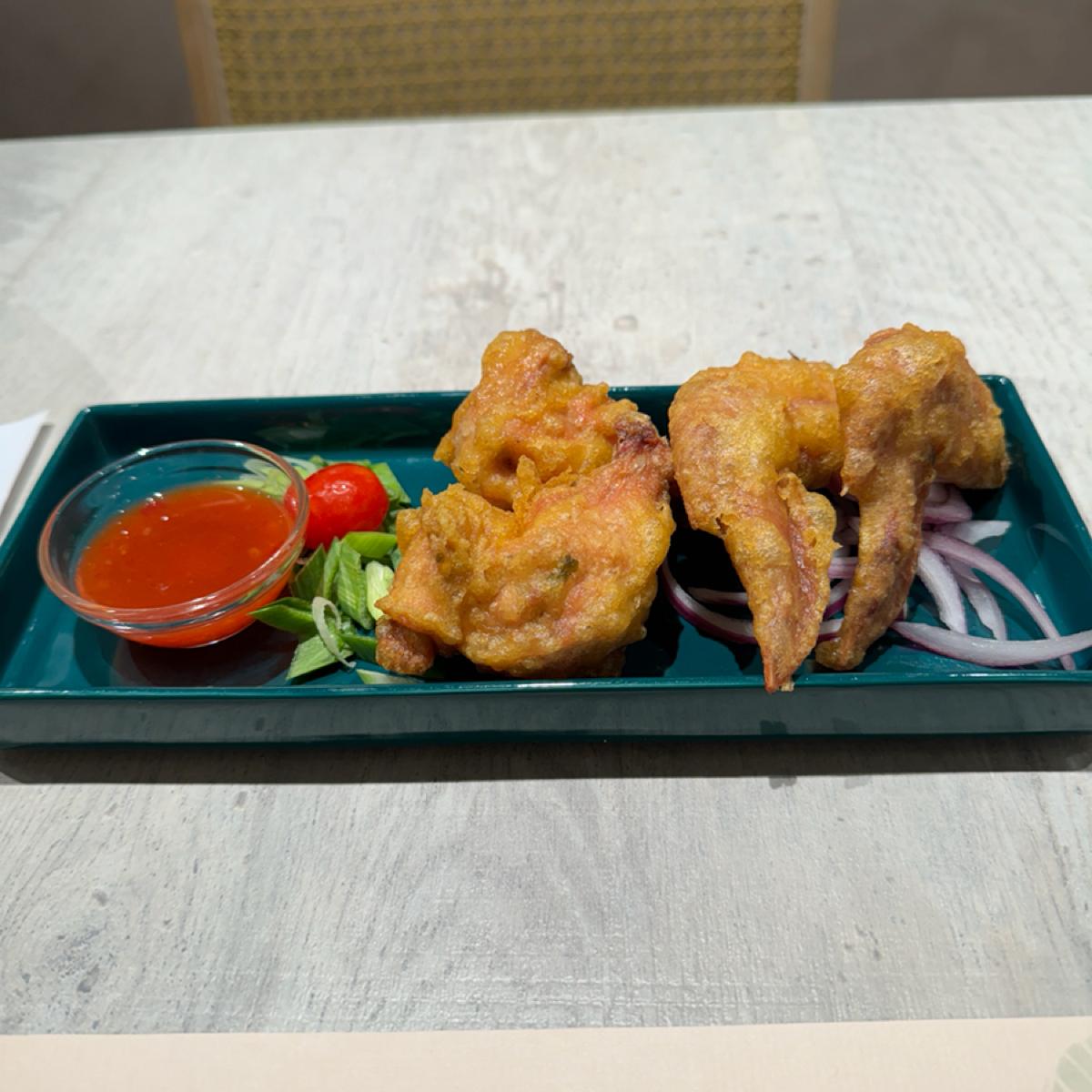 -獨享渣男香茅風味香酥雞翅-130-旁邊有些許青蔥與紫洋蔥。配上濃稠的酸辣醬。份量有兩個小雞翅與小腿。外皮的部分是很薄脆帶有南洋風味。雞肉本身有用香茅醃漬過所以有香茅的香氣,不過本身不會太鹹。肉汁還算多。喜歡南洋風味的炸雞可以嘗試