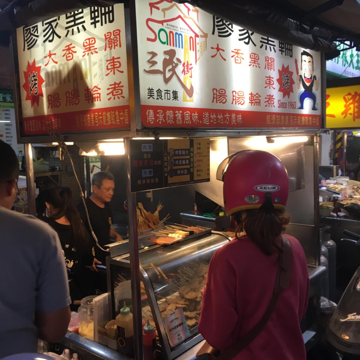 高雄市三民街菜市場,超級有名的,裡面好吃的一堆,共有兩間賣黑輪的,另一家就在正對面,我是習慣吃廖家的,他們家的烤黑輪最好吃了,大腸包小腸也還不錯,通常用餐的時候人很多,在菜市場裡面,所以停車沒有那麼方便。
