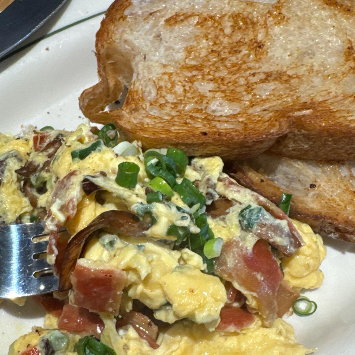 約下午兩點左右到,位置還有蠻多的,排隊點完餐後餐點會送到位置上,這次點了培根炒蛋,培根是素培根,炒蛋不只有蛋,也有炒洋菇,整體來說配附的兩片麵包還蠻好吃的~
