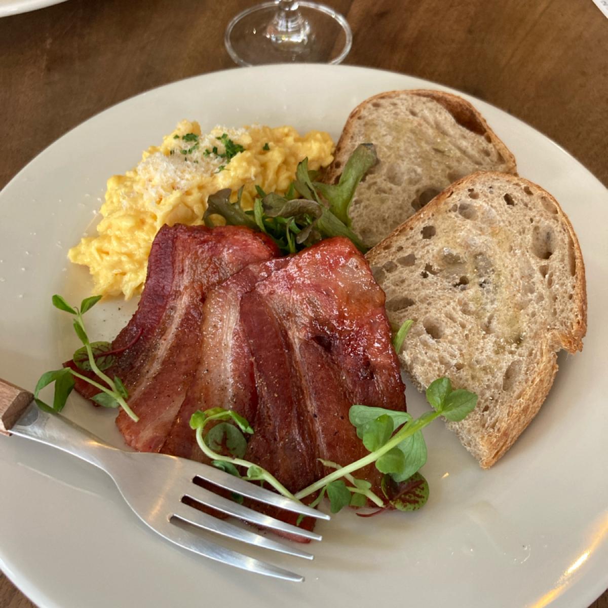 午餐時間點了酸種麵包炒蛋厚培根🥓炒蛋濕潤滑嫩,若覺得不夠味有胡椒可加;本來不抱期待的酸種麵包意外好吃,上面有淋點橄欖油,個人覺得培根太硬,但友人比較喜歡這種硬脆的口感,因為配料的味道都較淡,配上有點鹹度的培根整體完美