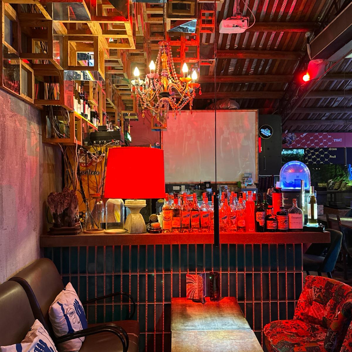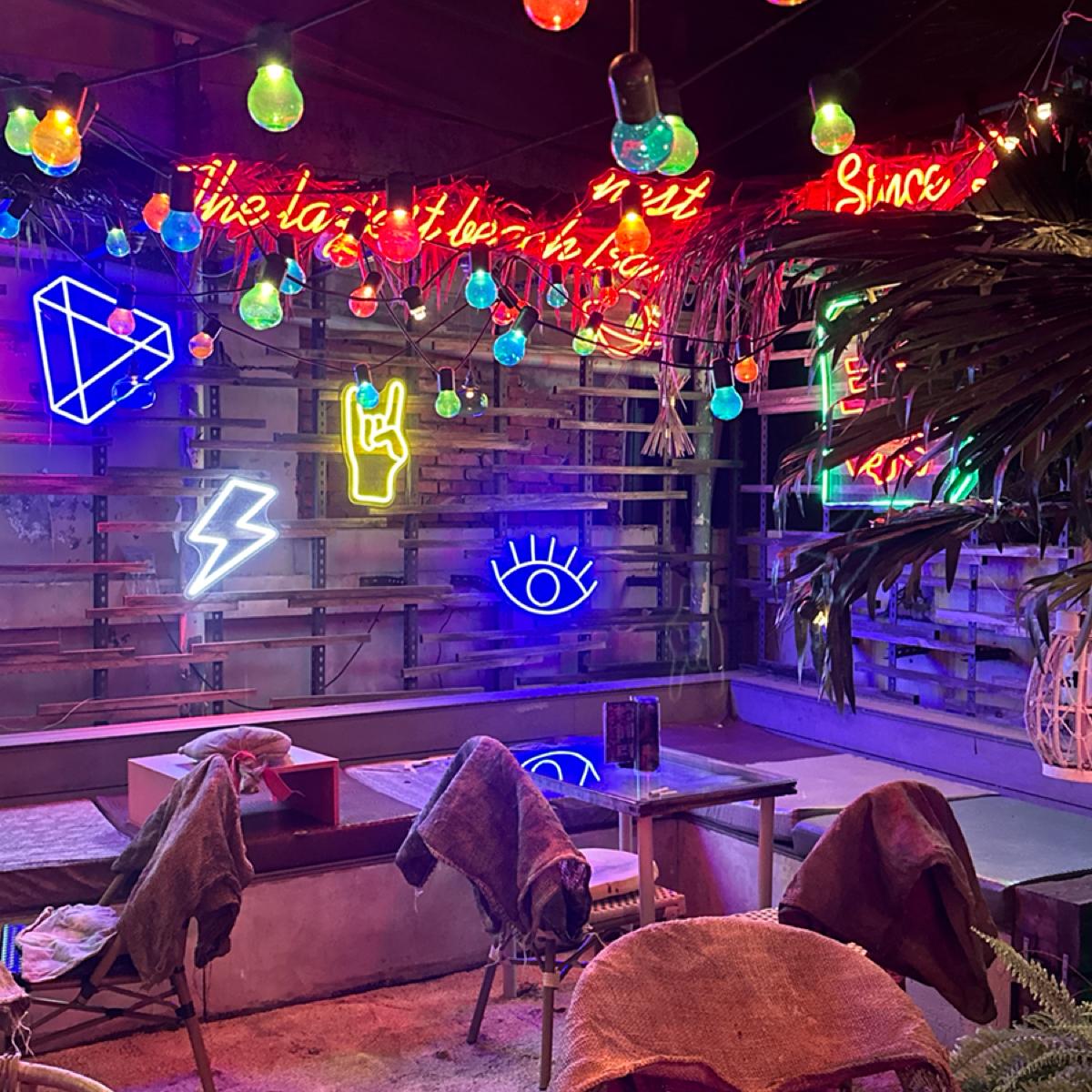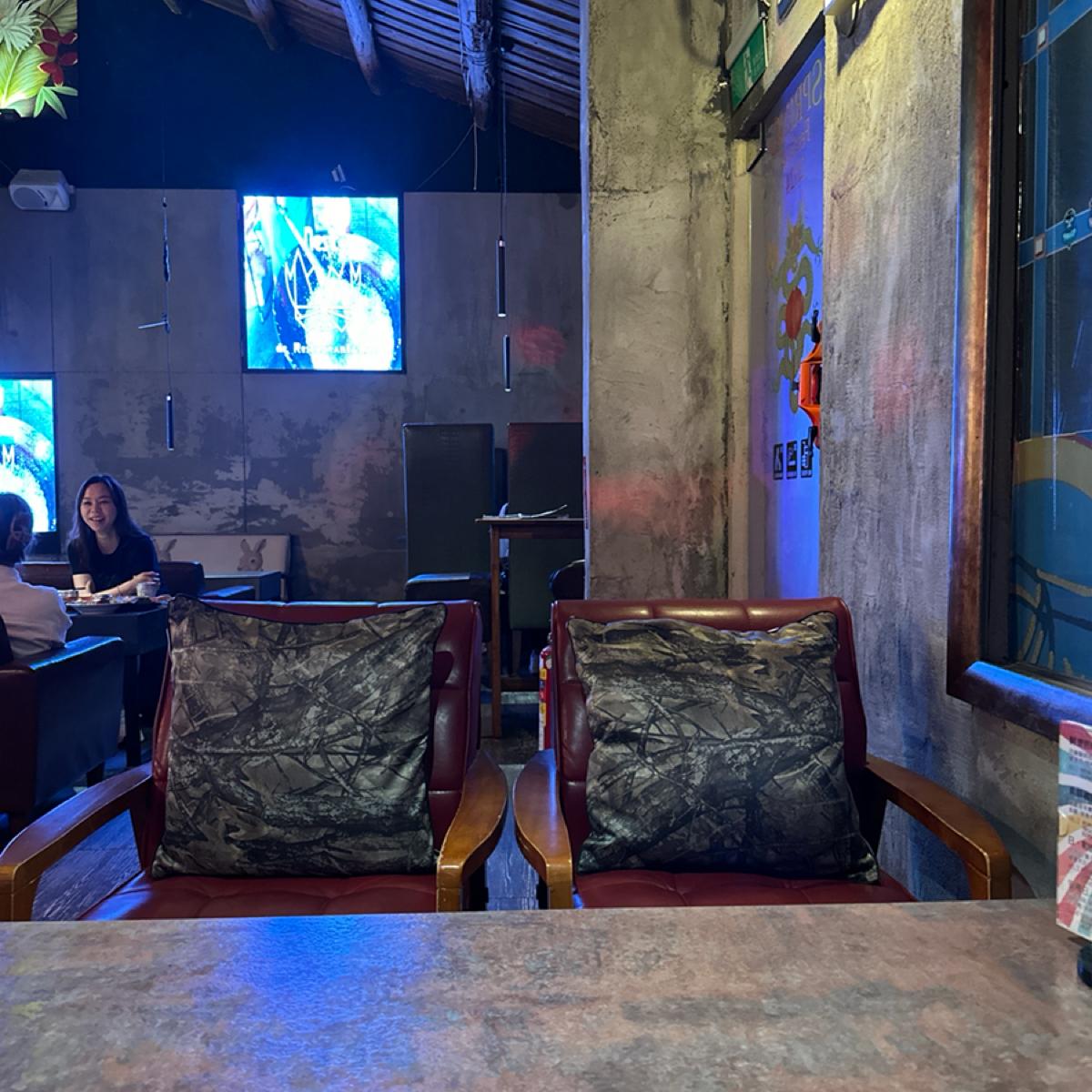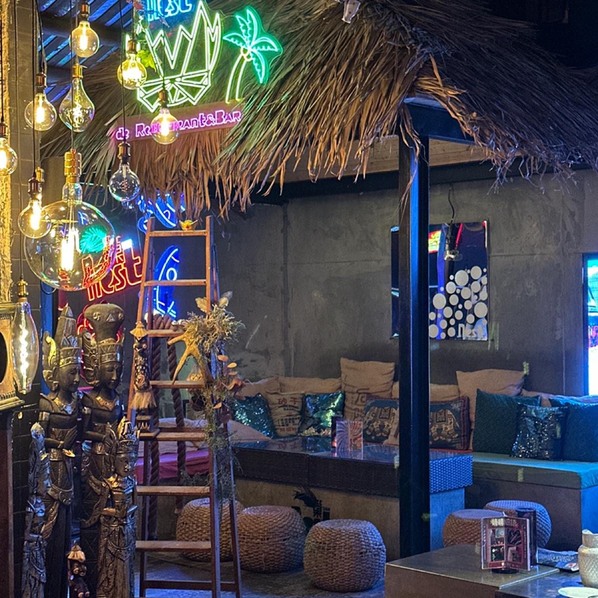 店內進門口映入眼簾的是石子地板和藤椅打造出的南洋渡假風格,戶外用餐區適合拍照沒冷氣,走入店內草蓆屋頂打造出的小屋氛圍感、投影螢幕、霓虹燈管,讓整個空間多了一種夜店狂歡的氣息卻又意外的放鬆空間