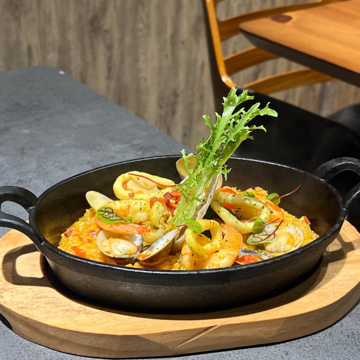 有蝦子🦐、小卷、扇貝和蛤蠣,滿滿的海鮮超豐盛,燉飯的基底是紅醬,搭配起來非常開胃好吃~