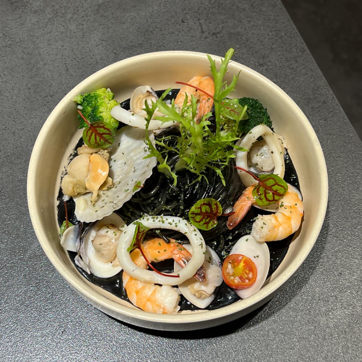 海鮮有扇貝、蛤蠣、蝦子和花枝,墨魚義大利麵非常濃郁好吃,就是吃的時候會有點形象破滅🤣