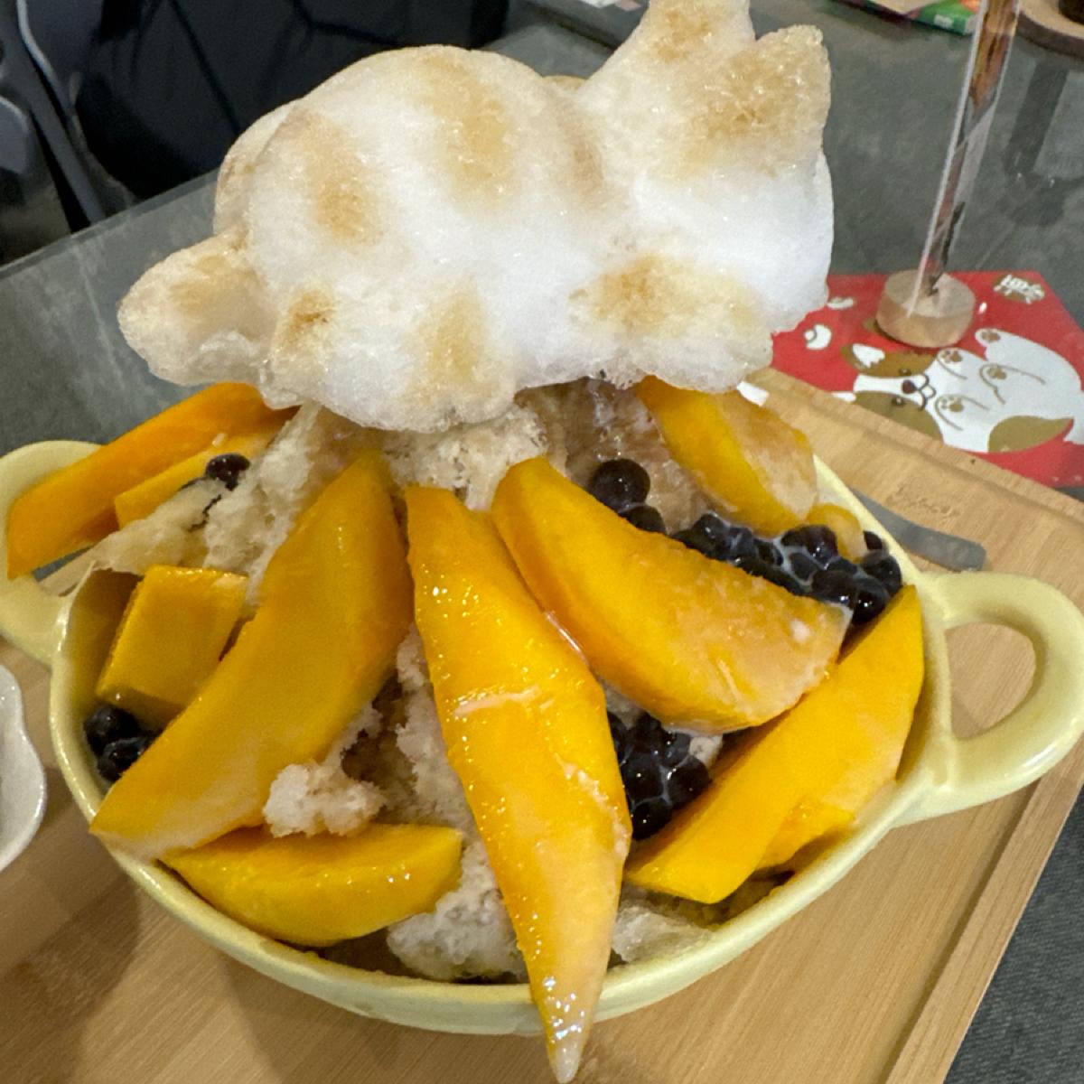 今天點的是超級霸道總裁芒果冰290「份量巨大建議兩人以上一起吃」裡面有:(新鮮芒果、珍珠、煉乳、仙草奶凍),上面還有一隻黑糖冰的斑紋刨冰貓。
