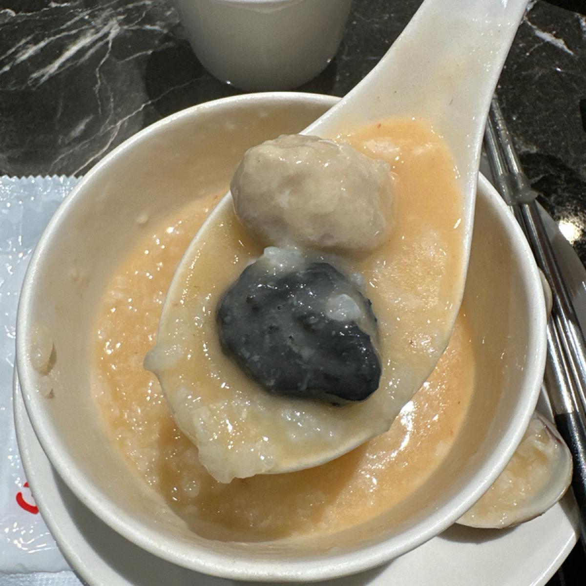 粥裡有蛤蜊、白蝦、干貝絲、手工丸子、堅果醬及蔥花,隨便一撈都是滿滿的料,白蝦是切半的,不需要動手剝殼,手工丸子有貢丸及墨魚丸,生米現點現褒的粥吸飽了食材的鮮甜味,口感綿密滑順,單吃就很夠味,加點胡椒風味就又更上一層樓!