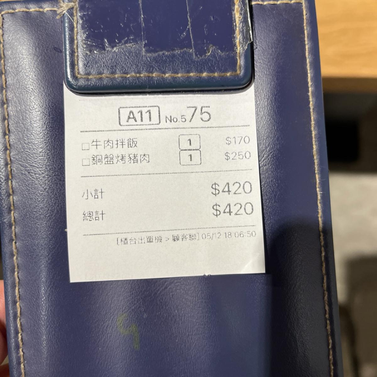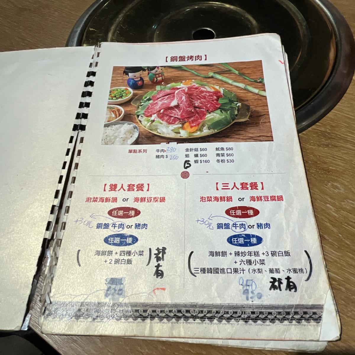 銅板烤豬肉,新臺幣$250元,豬肉要烤一下,不想太乾可以加到湯汁去煮,豬肉吃起來軟嫩可口,湯喝起來偏鹹,要配白飯或清淡的小菜搭配才行,還好桌上都有白開水。