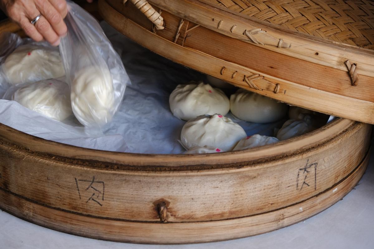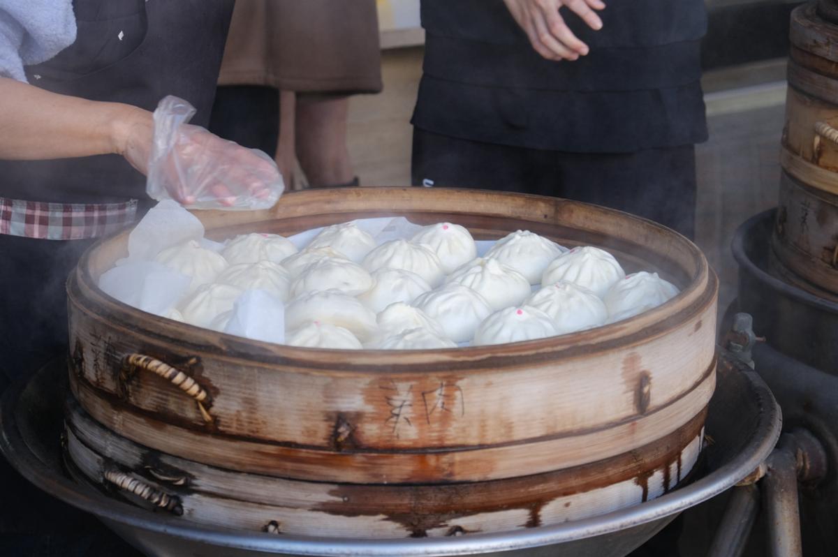 首先是從白熱騰騰蒸氣中,出爐的白色肉包,麵皮鬆軟而不乾口,肉餡雖稱不上飽滿,一口咬下些許蛋黃混著絞肉,搭配得剛好,不油不膩且清爽。