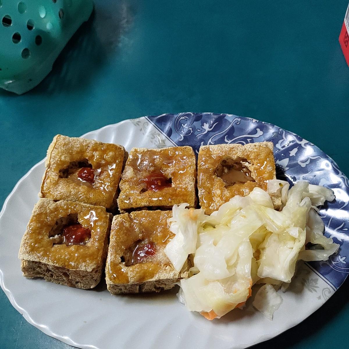 臭豆腐炸的外皮很酥脆,內部湯汁算多,配上一點泡菜(滿清爽的)風味還算不錯,另外可以選擇辣度(加辣椒醬),一份有五塊臭豆腐賣60元,整體來說算水準以上。