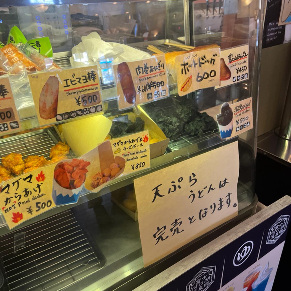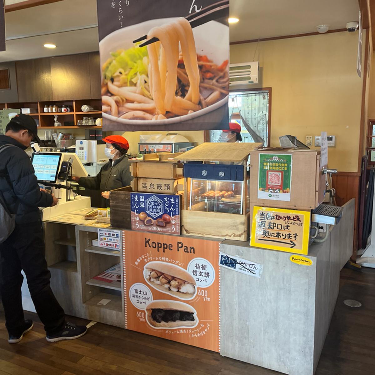 位於富士山河口湖站裡面的小吃販賣店,有熱食飲料,旁邊有座位區