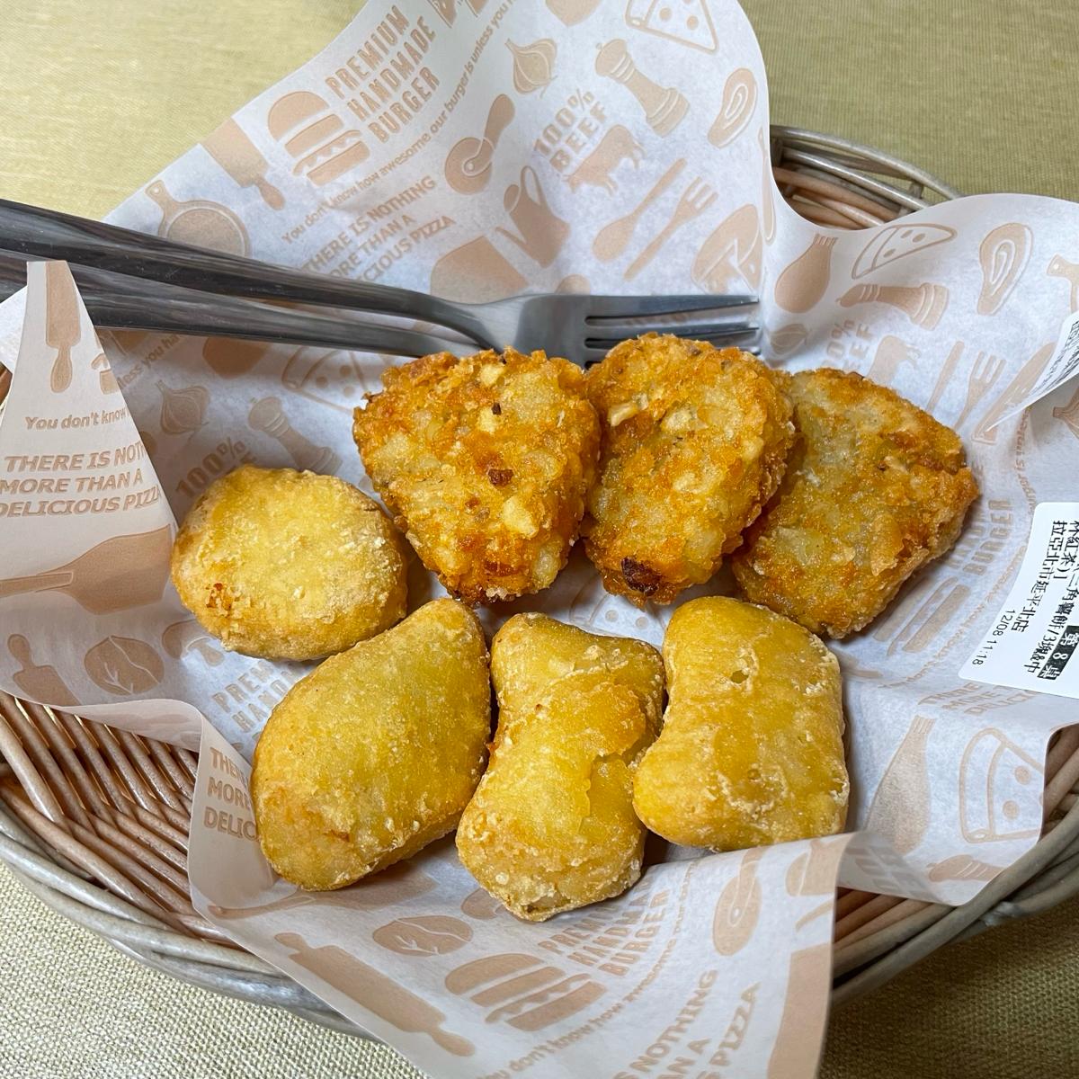 另外配餐有點薯餅和雞塊,雞塊和一般早餐店的不太一樣,有個特殊的香料味(?),蠻特別但我不是很喜歡,還是比較愛常見的那種雞塊;薯餅不錯吃,但有點太油了,要一直沾番茄醬解膩