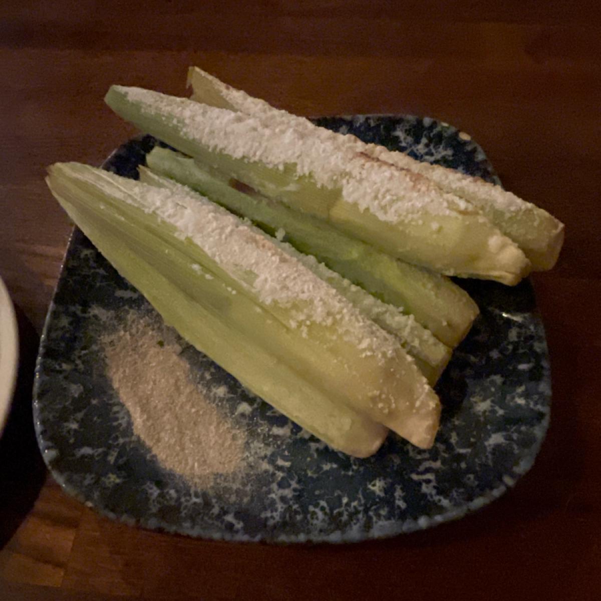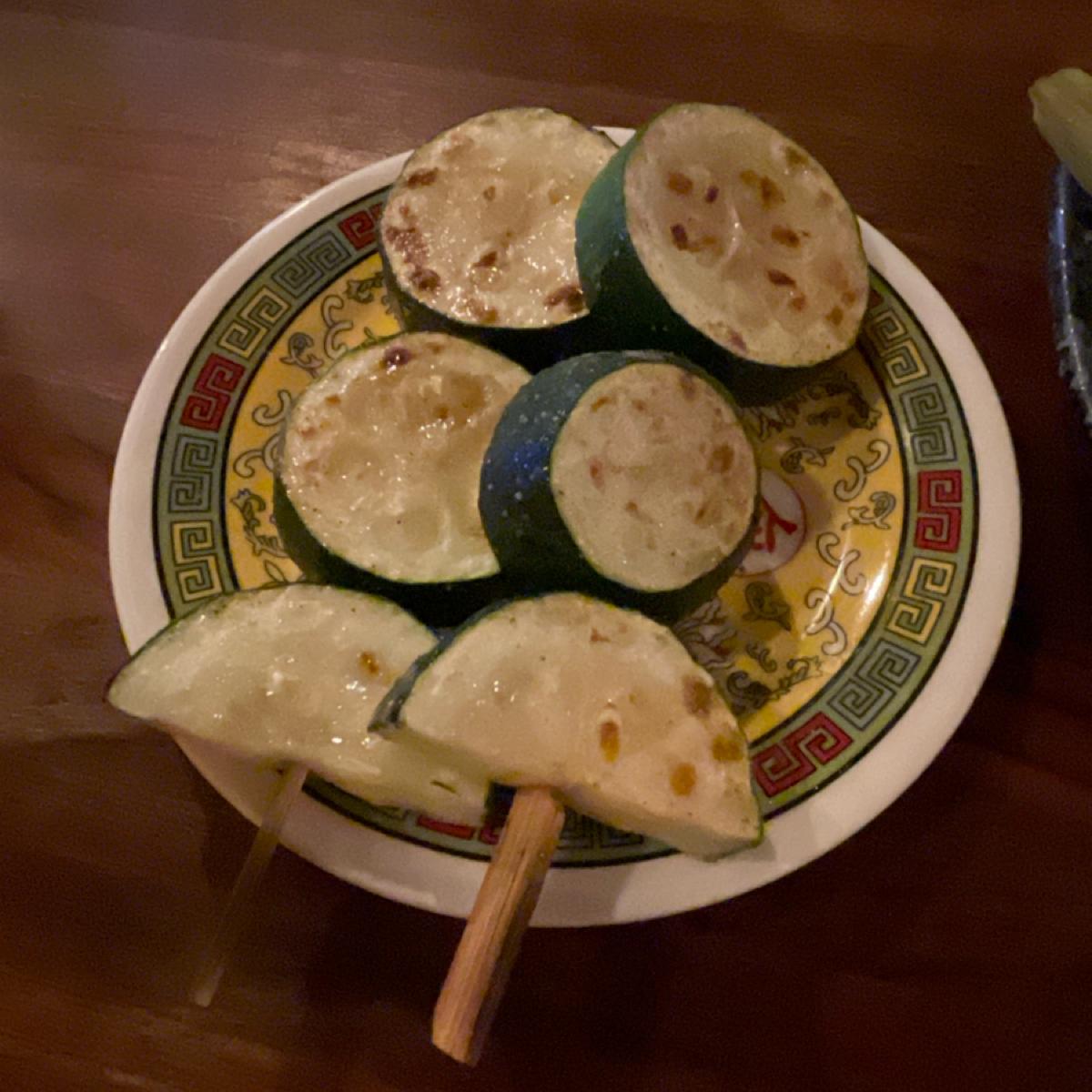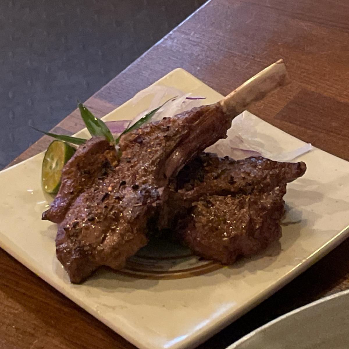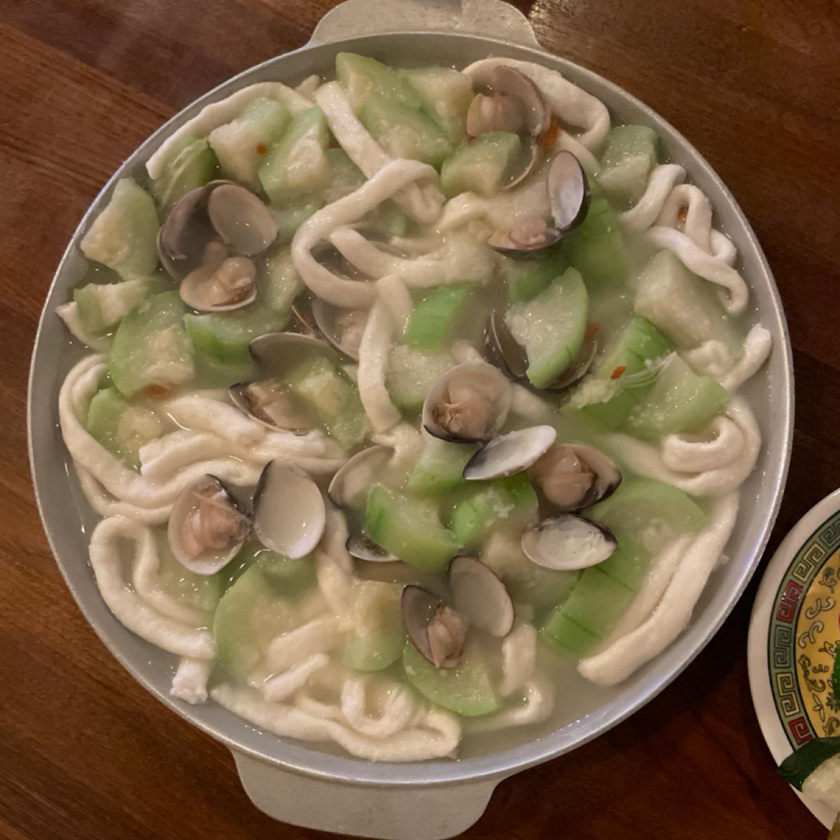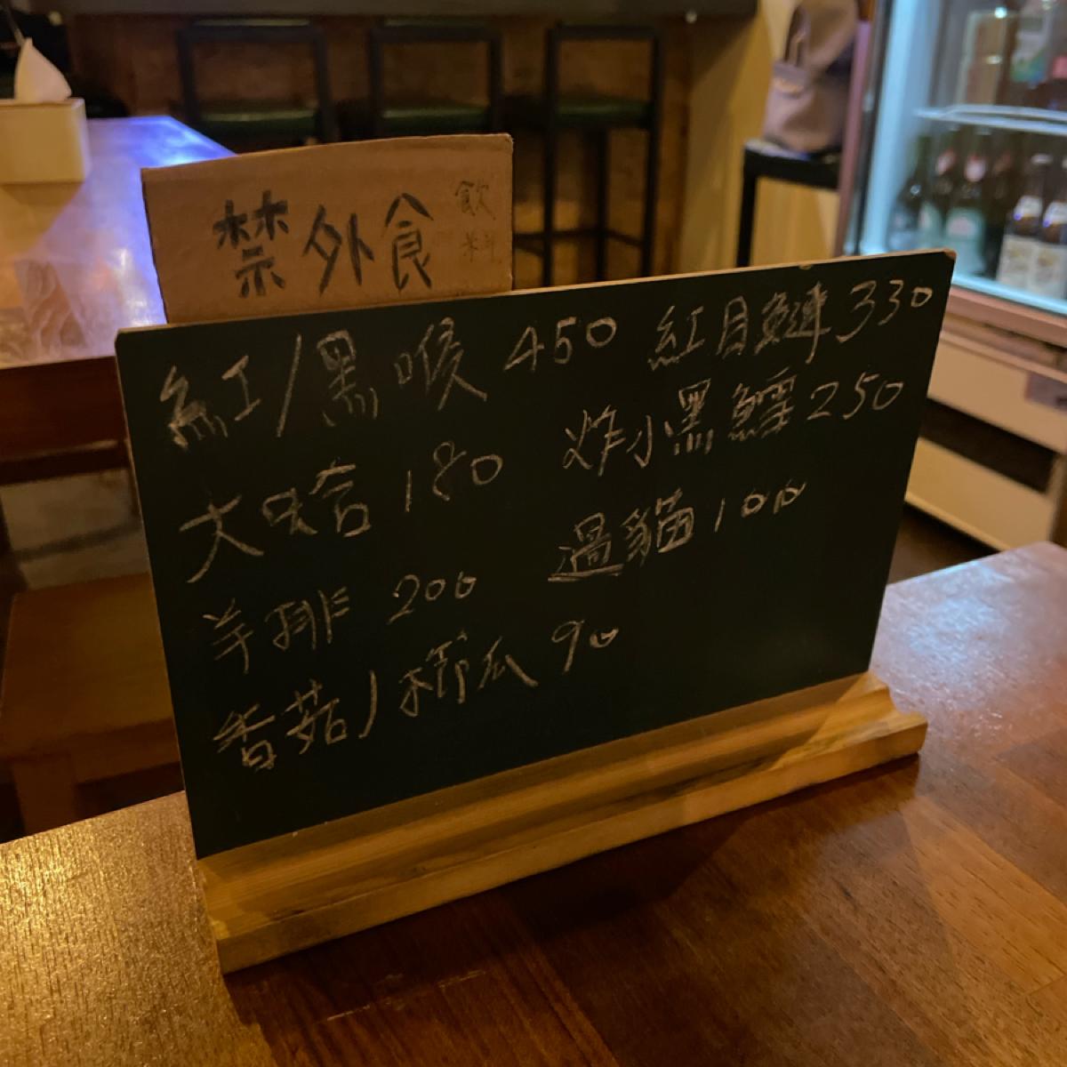 菜單讓我想到以前的照片簿,品項以烤物居多,桌上有今天限定的菜單可以參考,菜單上寫了烤魚必點,剛好今日菜單有紅/黑喉,就請老闆娘(?)推薦了,她說今天黑喉更漂亮,我們就點了,吃起來肉質細嫩,蠻好吃的。她還推薦絲瓜蛤蜊粄條是招牌,超級大盤我們三個人吃到超飽,絲瓜蛤蜊一直是很搭的食材,吃起來不錯。我們再點了羊排,羊騷味不會很重,除了有點中間筋不好咬,其他部分我覺得調味蠻剛好,韌性牛肉串跟他品名差不多,是比較需要咀嚼,咬起來香的。節瓜蠻多汁、玉米筍就蠻正常。