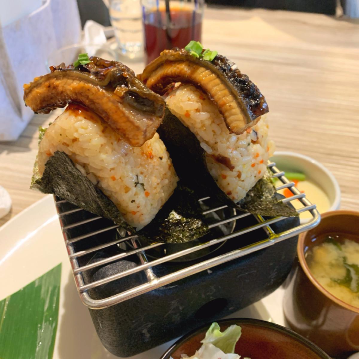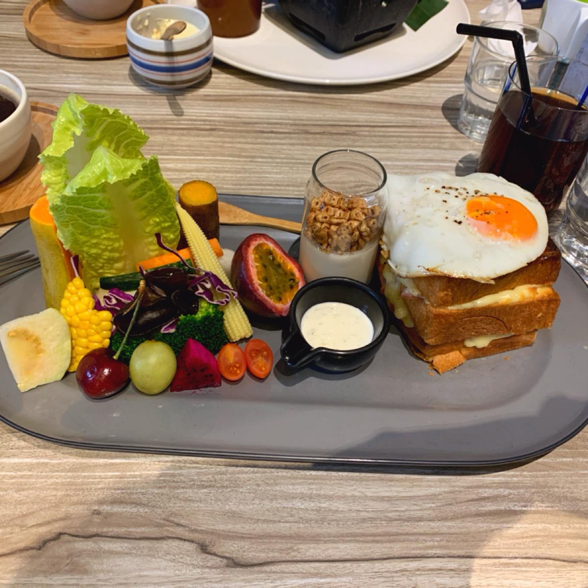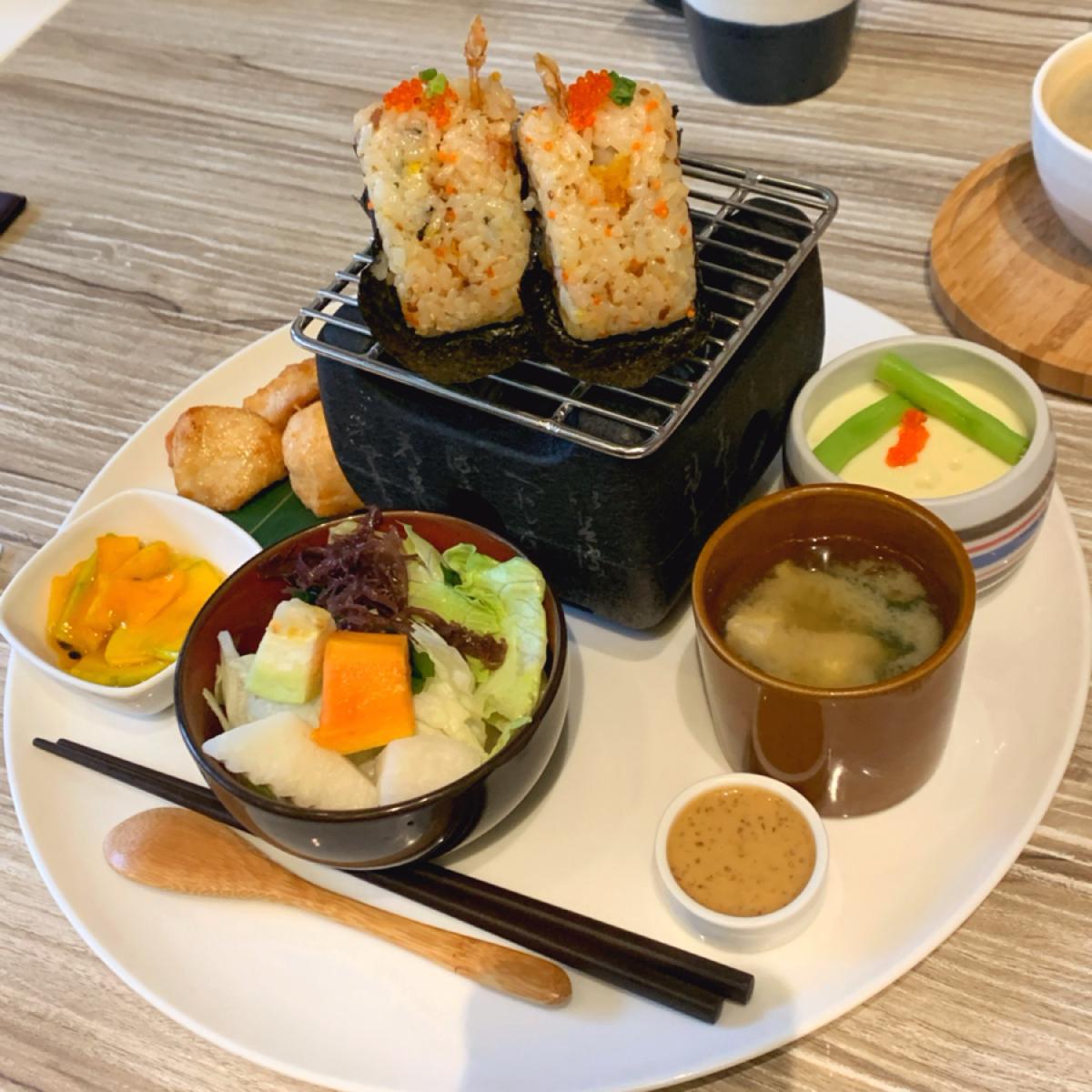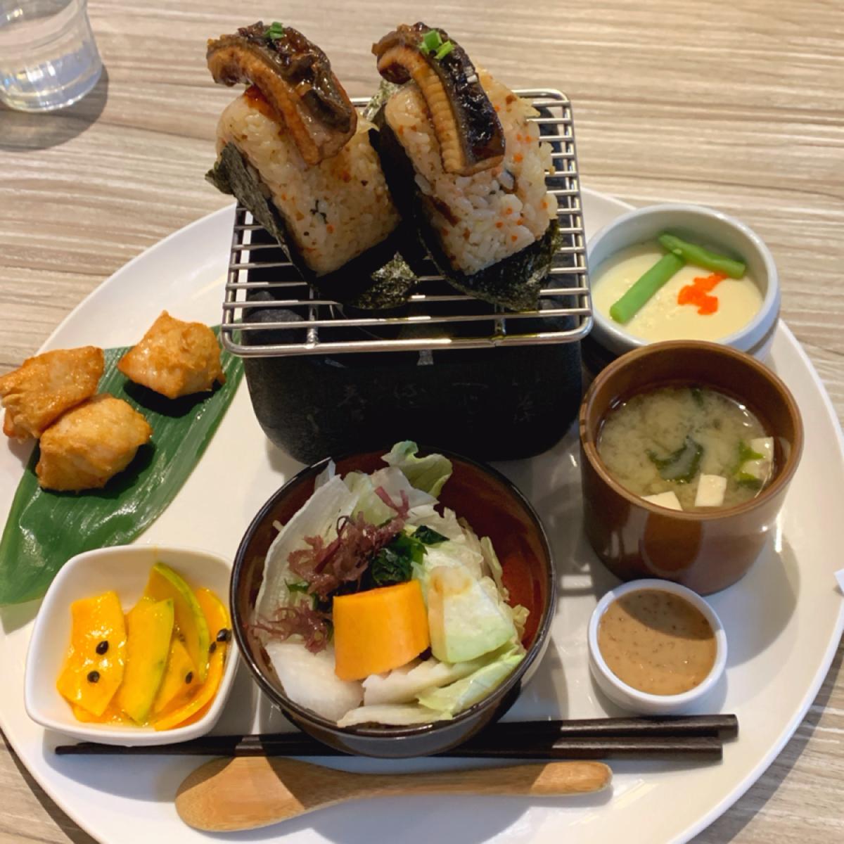 菜單主要分兩類,一類是大家熟悉的西式早午餐餐盤(像是班迪尼克、爐烤雞腿排、青醬海鮮),它們的餐盤很豐富,本身主餐的份量就很多,還會有7-8種的蔬果沙拉跟優格,還有一杯飲品(咖啡紅茶不加價),營養足夠又能吃超飽。另一種系列是日式烤飯糰,烤爐上放2顆烤飯糰(雖然烤爐僅裝飾用少了一味),還有味增湯、沙拉、蒸蛋跟唐揚雞,吃完超級爆炸飽。