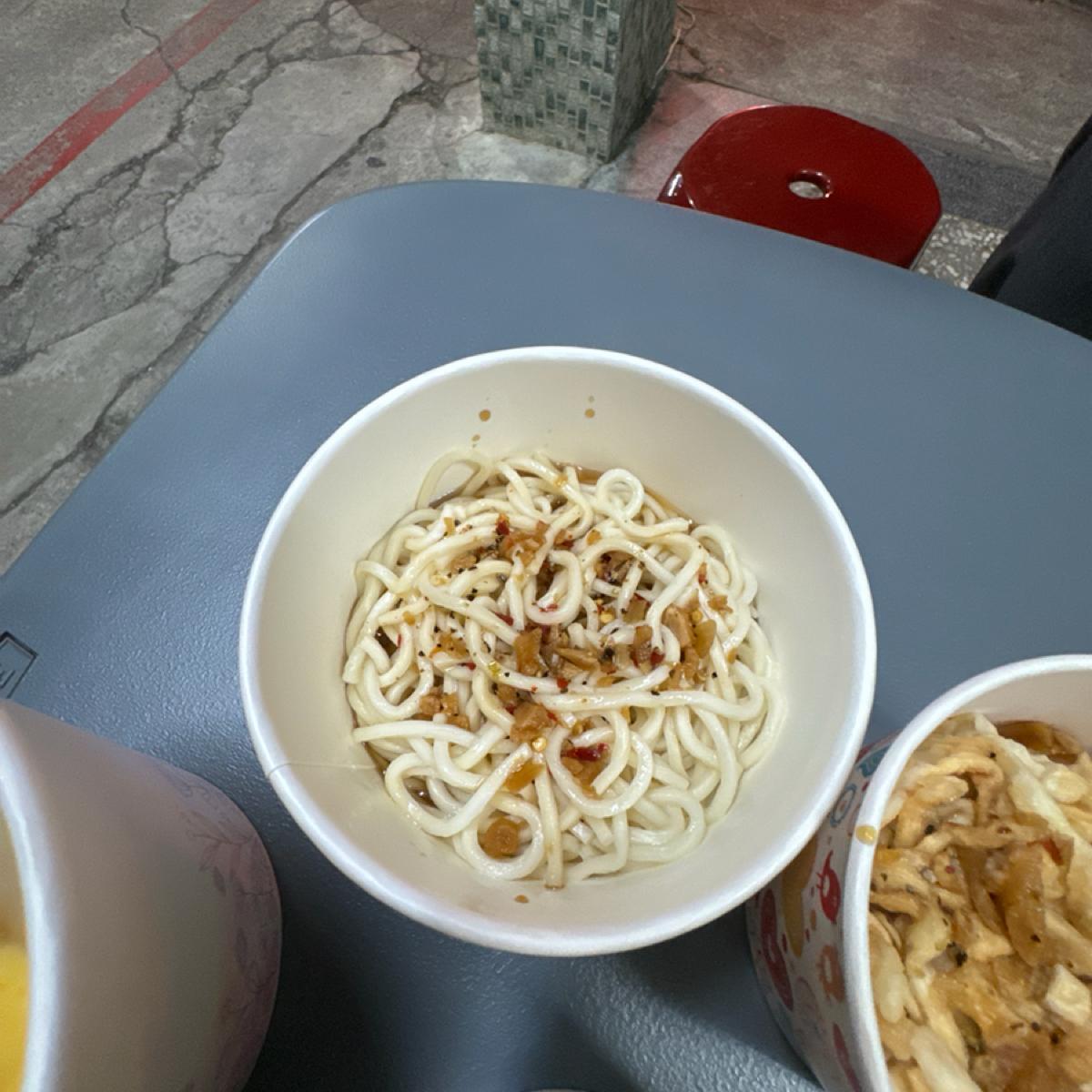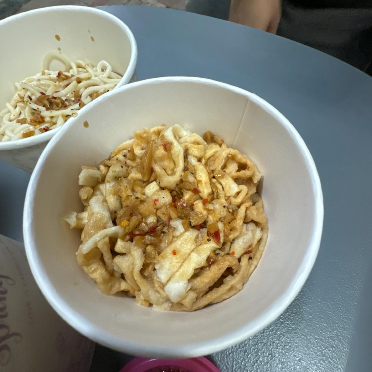 這裡賣的是比較少見的「日式關東煮」,用料很道地:玉子燒、竹輪、蟹味棒、干貝燒……每樣都很入味又不死鹹。除了關東煮,還有多達四種麵條可以選,搭配自家調的拌麵醬汁——以醬油為基底,加了蒜頭和一些辛香料,微辣開胃,可以依個人口味調整辣度,真的很好吃。