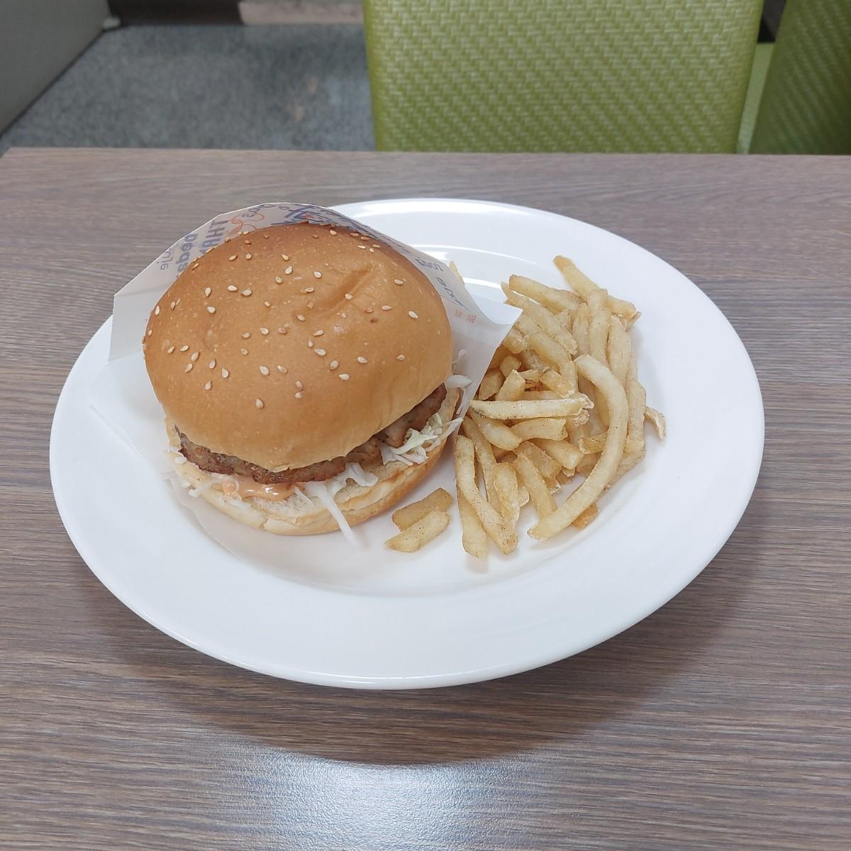 今日餐點: 最新的13號套餐美式起司大豬排堡加薯條, 漢堡比一個拳頭還大,頗有份量,內部的豬排是絞肉製成,厚度厚實,咬下去彈牙又有點爆汁,可惜肉味不重,滿分100我給75分,搭配的薯條份量也很多,男生吃一份可以吃飽。