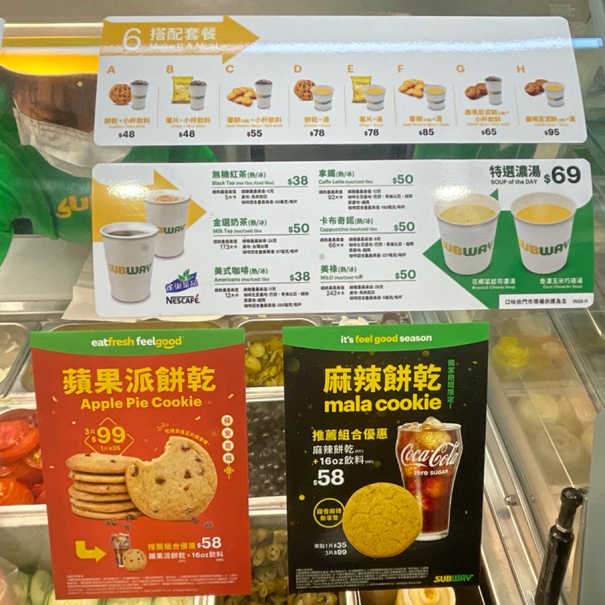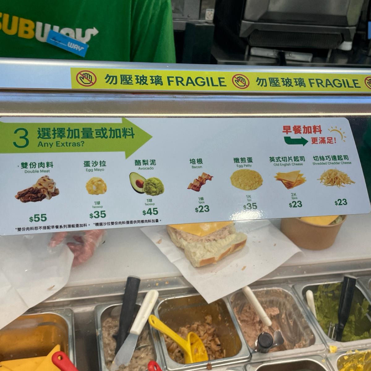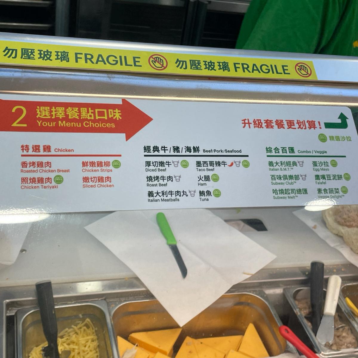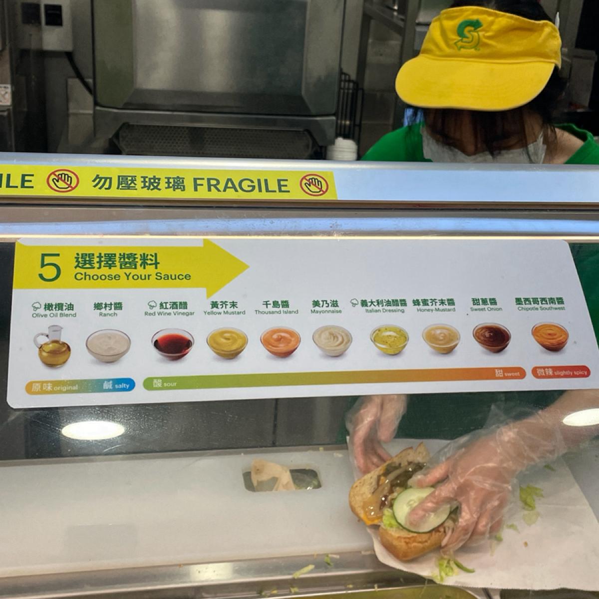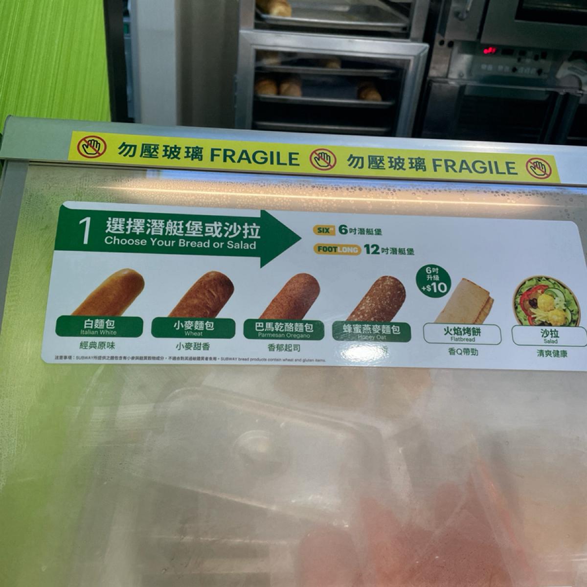 Subway 最大的賣點就是可以客製化,從麵包大小、麵包種類、主餐(牛雞豬魚都有)、配菜(生菜、洋蔥、青椒、番茄、醃製物等)加價配料(蛋沙拉、酪梨等)、醬料,到要不要加套餐(餅乾薯片、飲料濃湯),全部都可以客製化