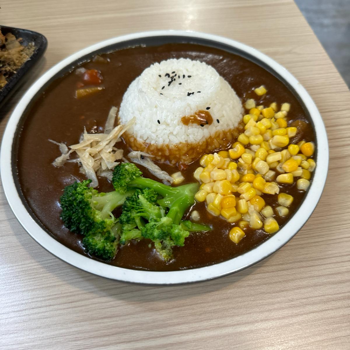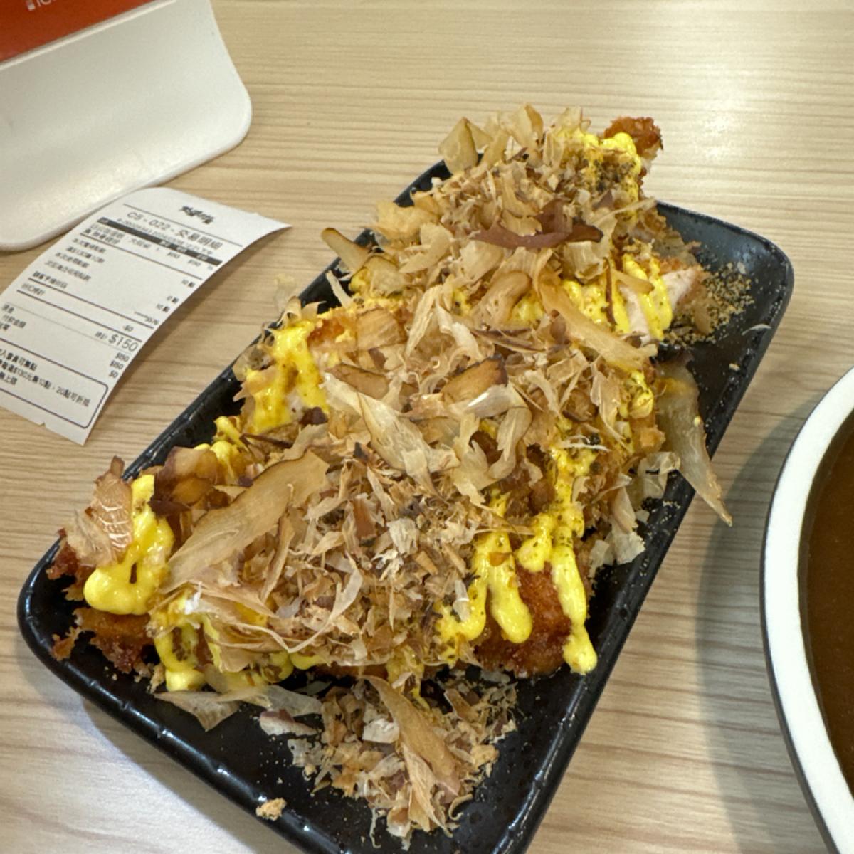 我這次點了日式咖喱飯-無骨雞排,雞排上給了滿滿的柴魚跟醬料,吃起來很夠味,然後是用炸的,咖喱飯的玉米是涼的,醬汁薄薄的一層剛剛好。