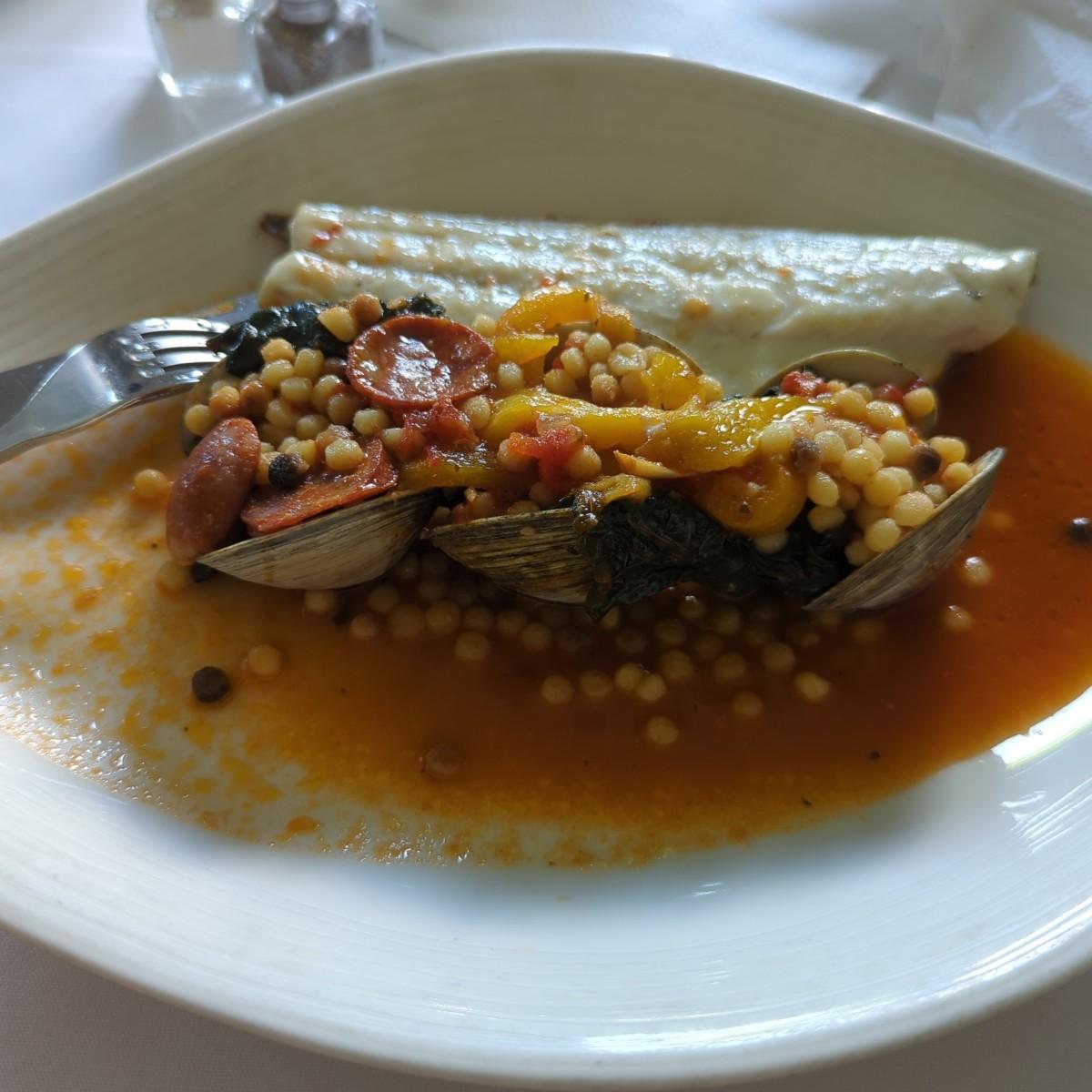 還有三個不小的小頸蛤(Little Neck Clams)。吃完蛤汁與醬汁合流,薩丁尼亞珍珠米型麵就更粒粒可口了。