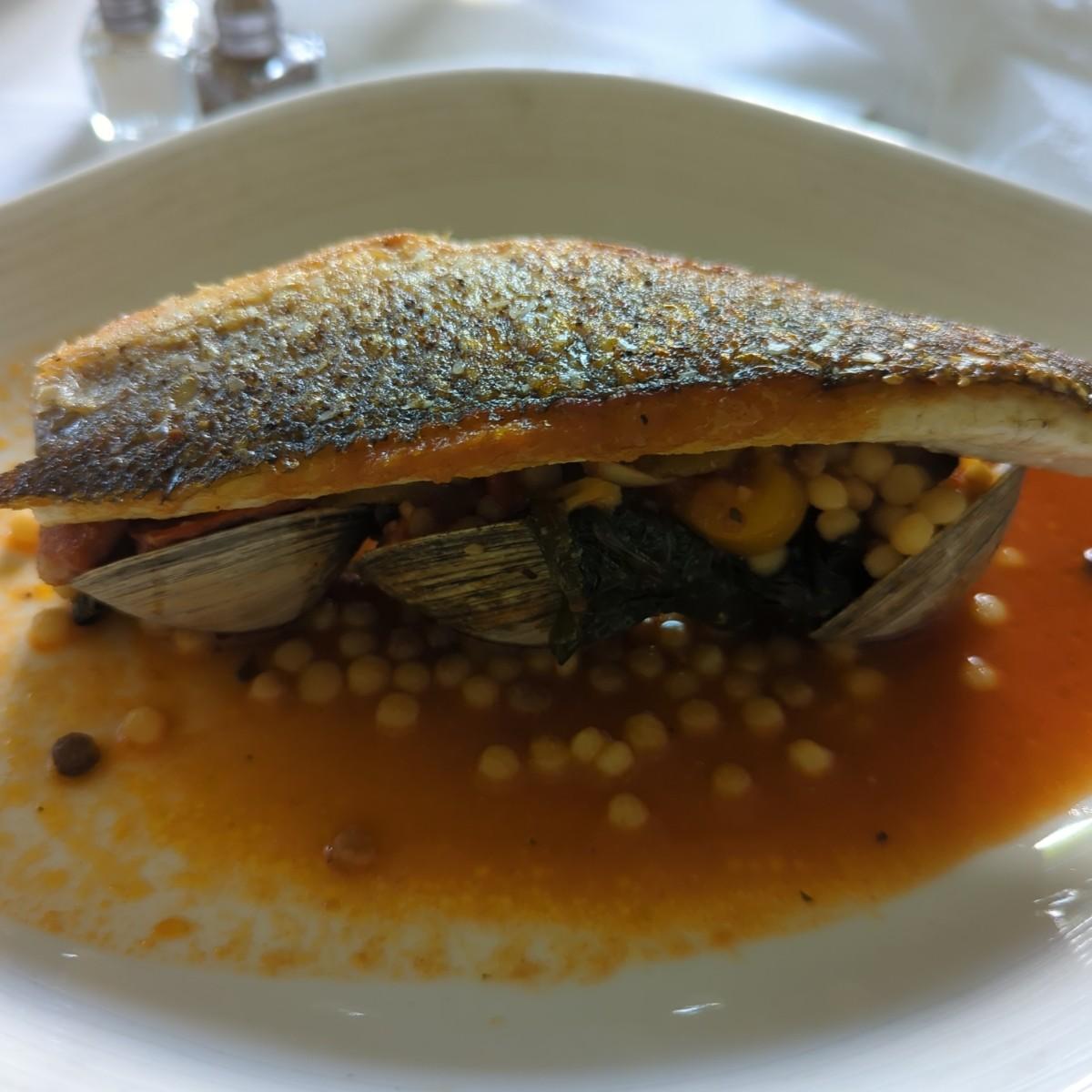 香煎(烤)地中海鱸魚(Branzino)相當大片且無刺。蔬菜(瑞士甜菜、烤椒、小番茄、蘆筍)與豬肉辣香腸(chorizo)很對味。