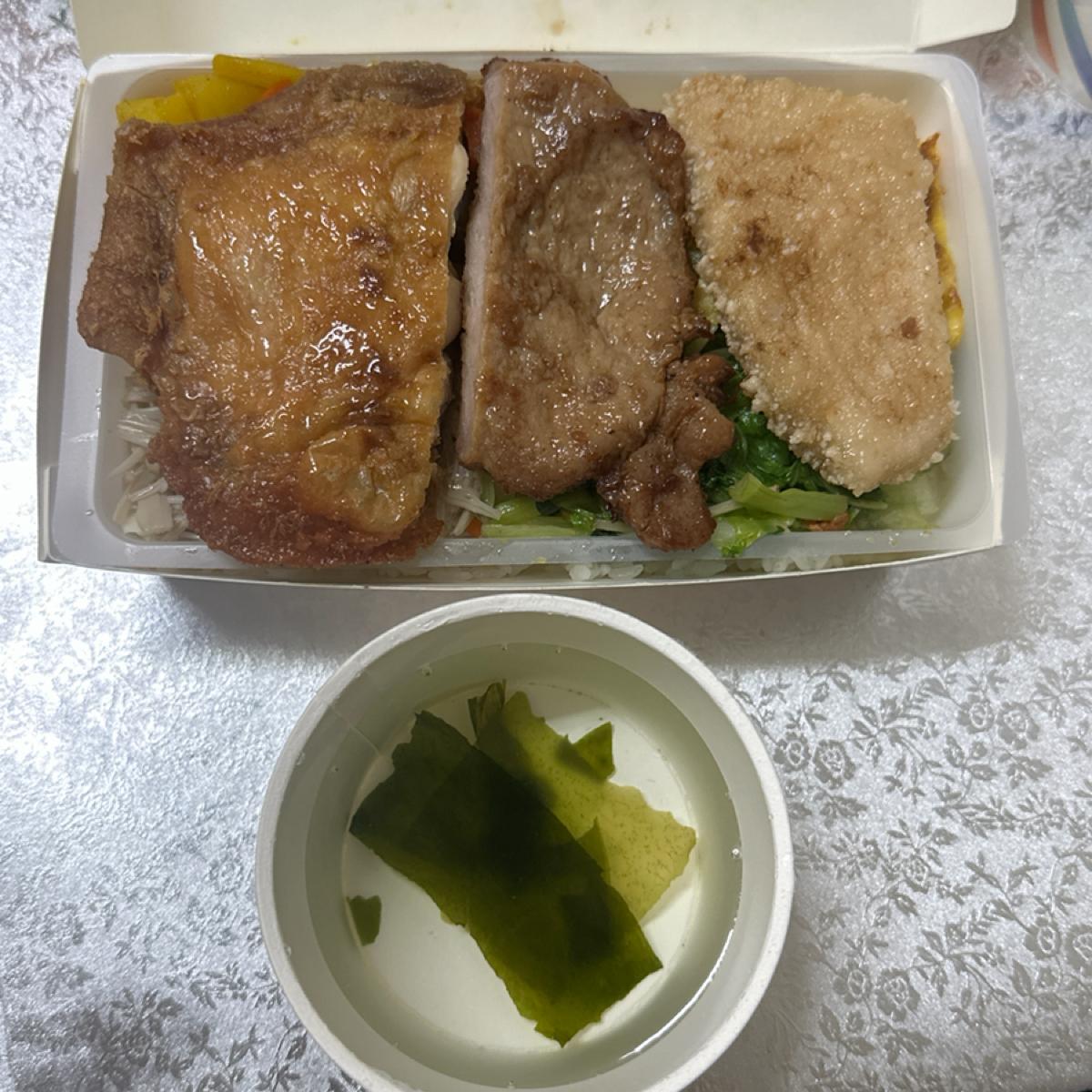 雞腿肉質嫩度,排骨滷的夠味偏甜,魚肉鮮嫩偏鹹,配菜咖喱、燙青菜、蛋和金針菇口味偏甜 ,4菜3主食一碗湯,吃完真的很飽,口味上非常豐富,外帶的便當竟然是是下層的方式,難怪便當盒可以不用大,很方便拿去。