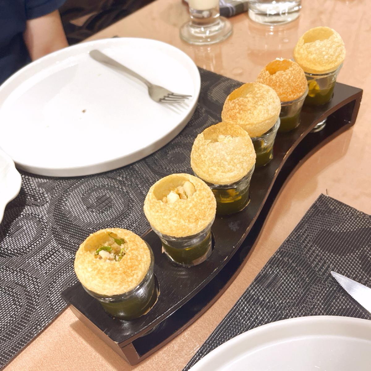《Pani Puri》特別想試試印度道地小吃,外殼酥脆、內餡清爽,搭配混合薄荷、芫荽、羅望子等多種香料的醬汁,有種淡淡的消毒水味,或許對台灣人來說會有點衝擊,不一定每個人都會愛,但它確實是一道非常有印度街頭靈魂的料理,值得嘗試