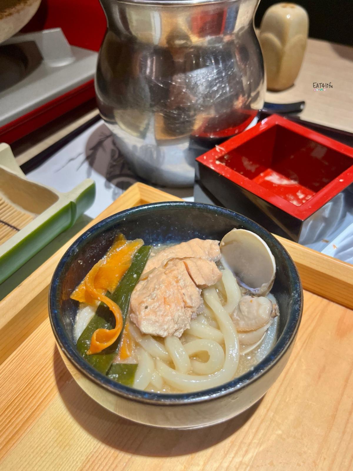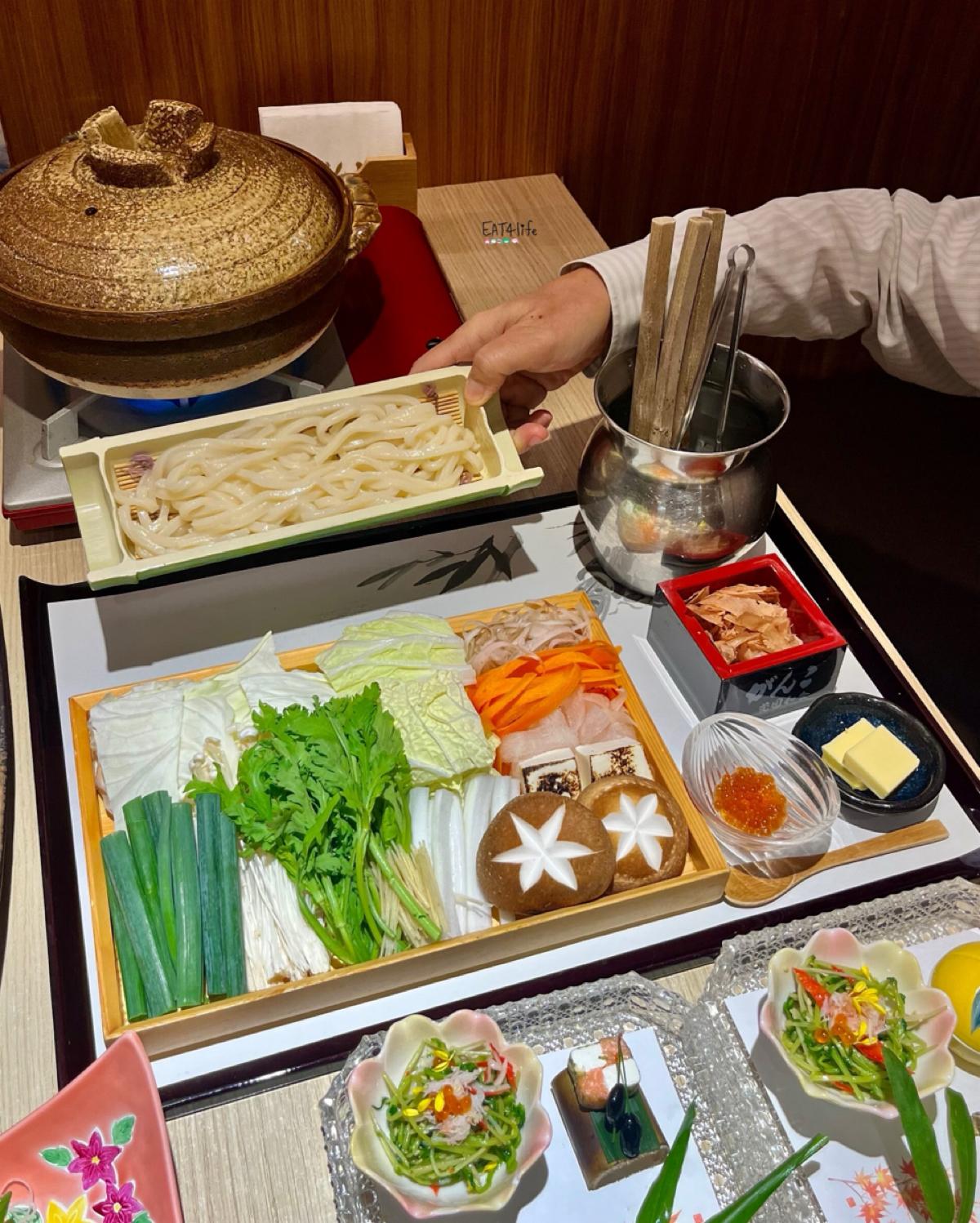 蔬菜盤有很多種類,有山茼蒿、高麗菜、山東白菜、金針菇、牛蒡、白蘿蔔絲、紅蘿蔔絲、香菇、蔥、煎過的豆腐,主食則是烏龍麵!可以搭配鮭魚卵一起享用~