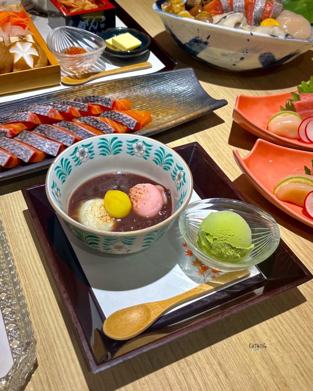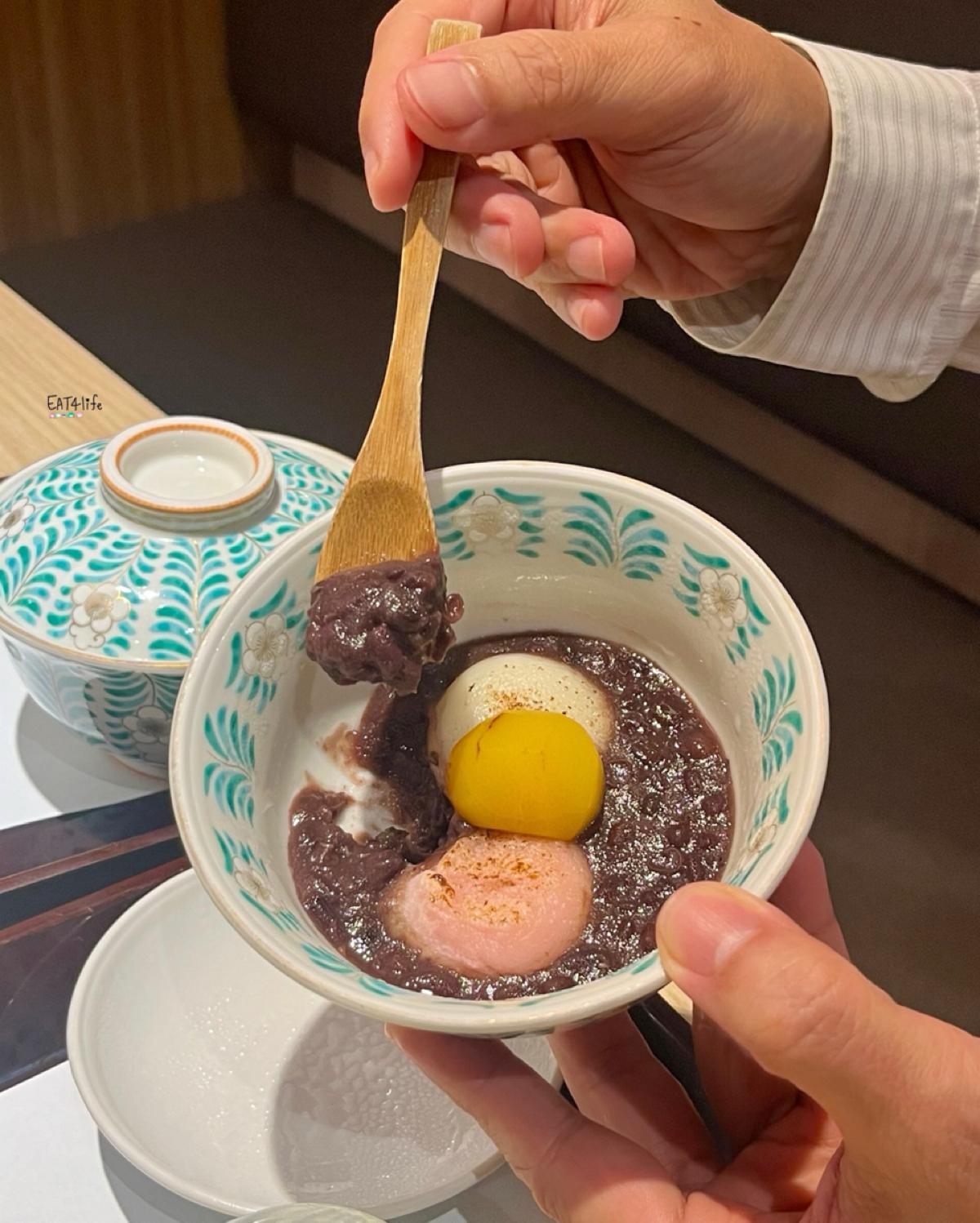 ➡️紅豆湯:甜點是紅豆湯和抹茶冰淇淋,紅豆湯是非常濃郁的,紅豆顆粒煮到非常軟爛,但還是可以看到紅豆本身,非常厲害!另外還有加上兩顆碳烤過的麻吉和一顆栗子,麻吉外皮因為烤過,所以吃起來有碳烤的香氣,搭配紅豆湯超讚!