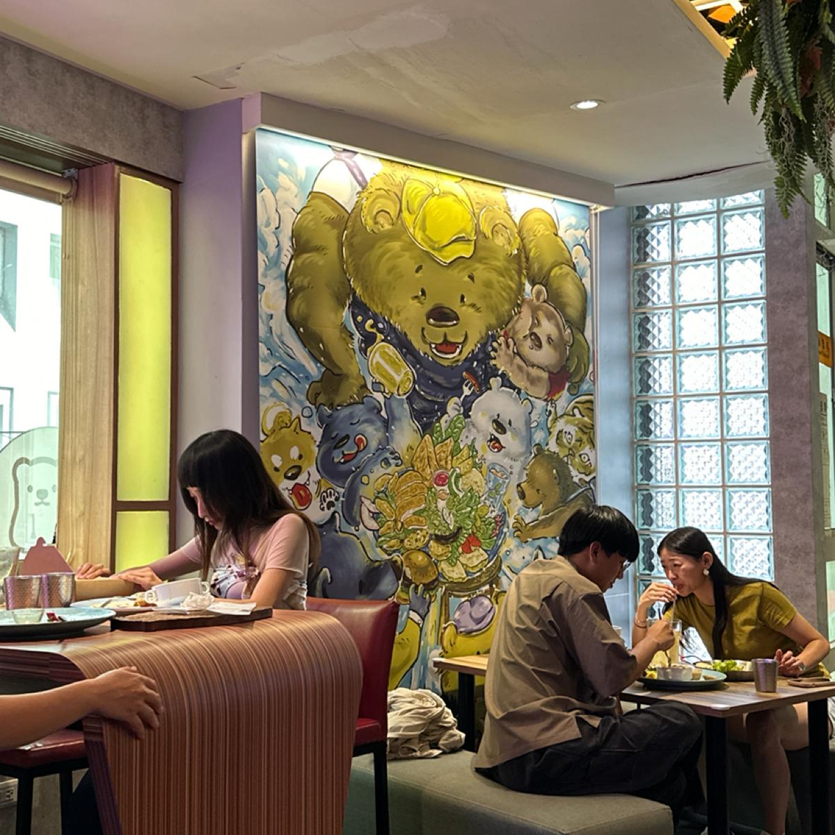 餐廳位於西門昆明街的2樓,基本上假日用餐時間座無虛席,店內佈置的很溫馨,五顏六色的燈光打在用餐空間,彷彿置身在奇幻的紫紅色泡泡裡。牆上還有一些他們熊族跟其他動物(狗、狼之類的)的壁畫,很可愛。