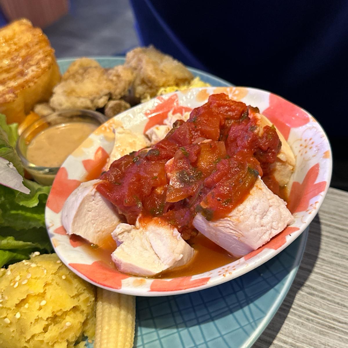 我朋友點的番茄醬雞胸肉拼盤也是不錯,雞胸肉不會太乾柴,且番茄醬是真的使用蕃茄下去熬煮,料理功夫絲毫不馬虎。但比起雞胸肉,我還是更喜歡我點的泰式椒麻雞!