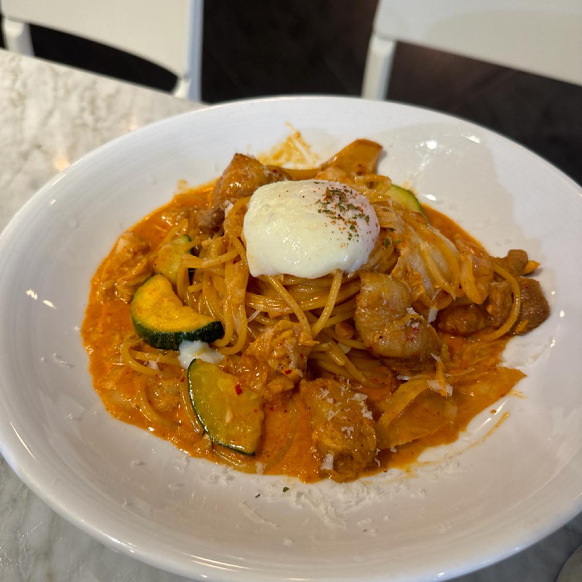 -泡菜奶蒜豬五花麵 喜歡這道的調味,酸甜酸甜醬汁與義大利麵超級搭,雖然是泡菜但不會很辣,很適合不吃辣的朋友。