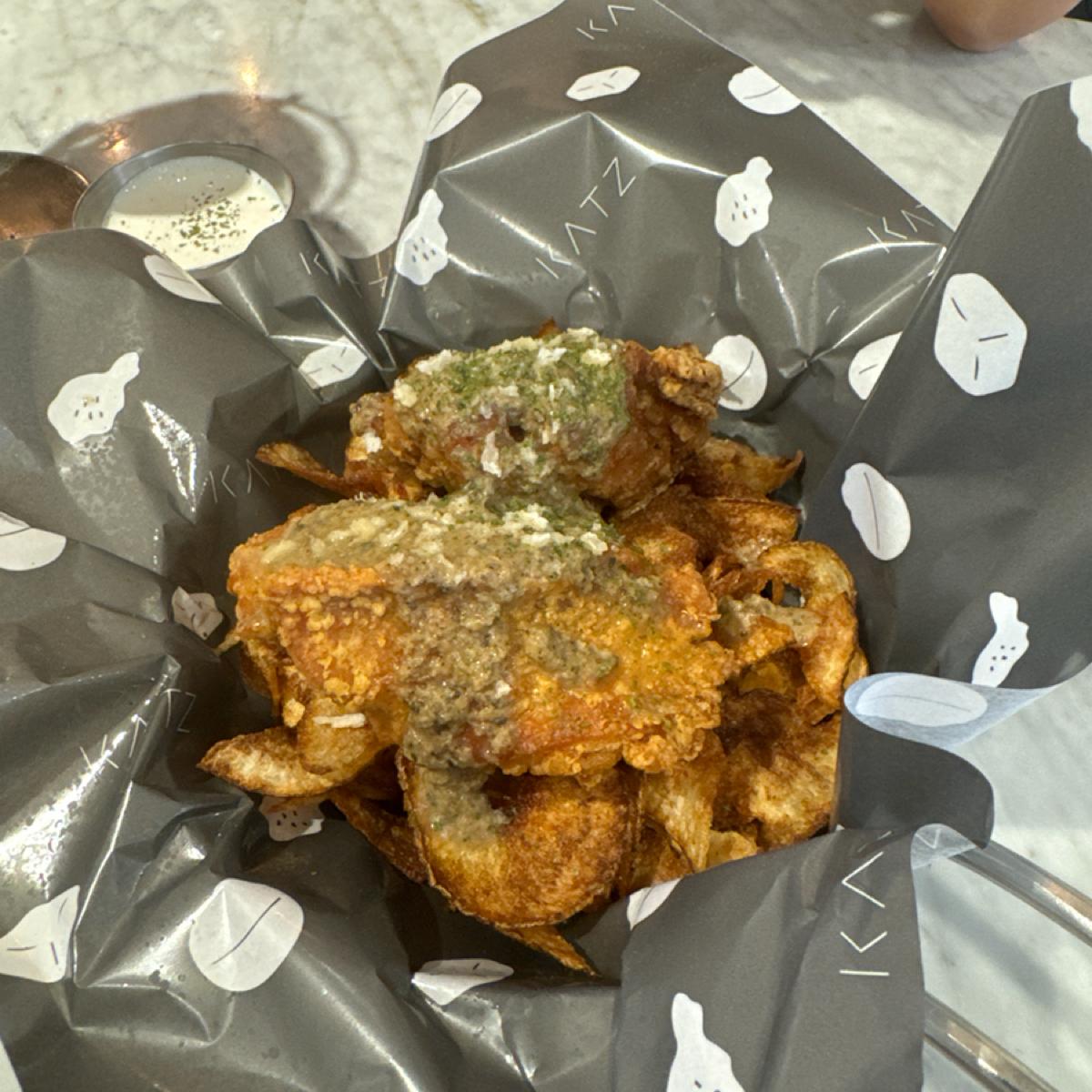 -松露醬炸雞(2塊)淡淡的松露味配上酥脆的炸雞,吃起來也有蒜味,撲滿脆脆薯片與雞肉一起吃,雙重口感。