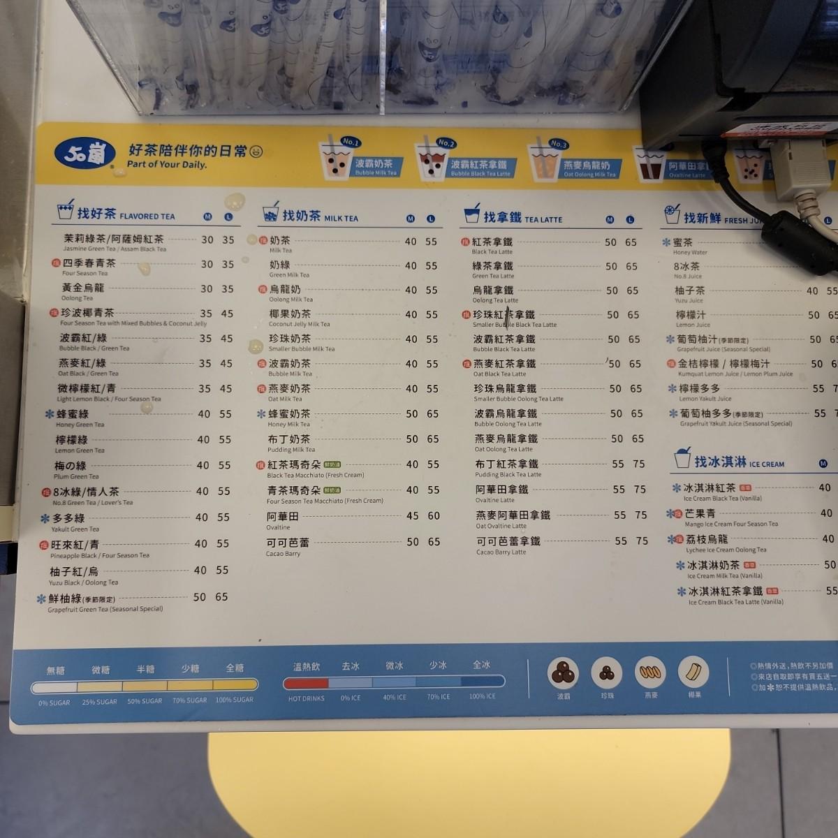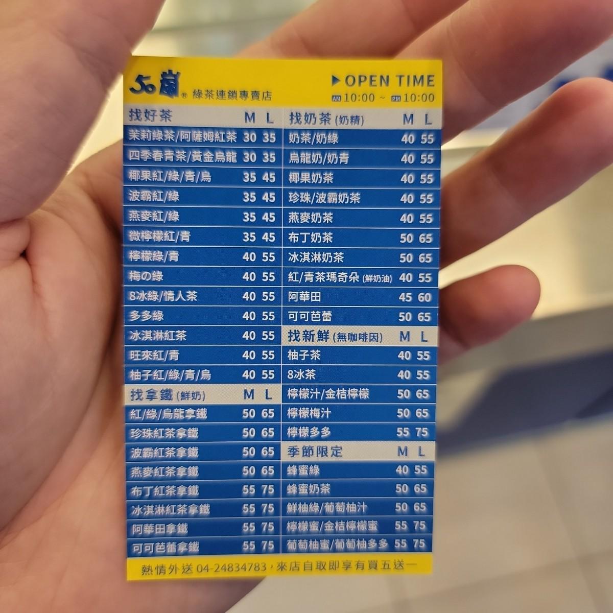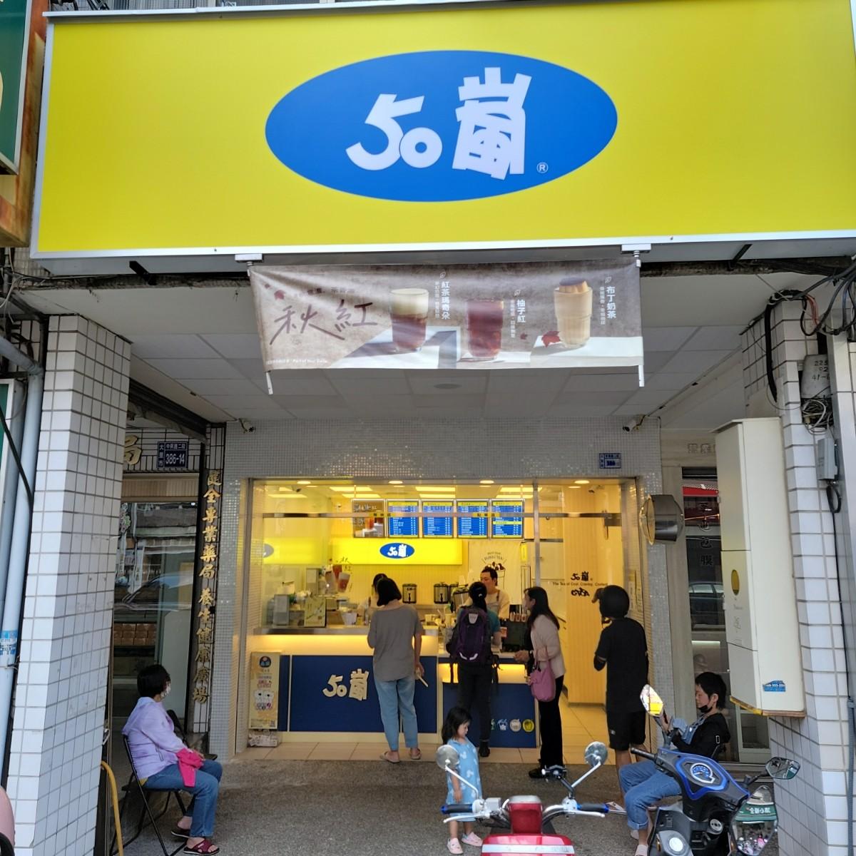 這條路算是大里很熱鬧的一條路,附近也很多飲料店。承襲50嵐一貫的藍黃配色,店面外有大約六張黑色椅子可供等候時休息,櫃台一樣有一些溢出的冷氣可以稍微降溫一下