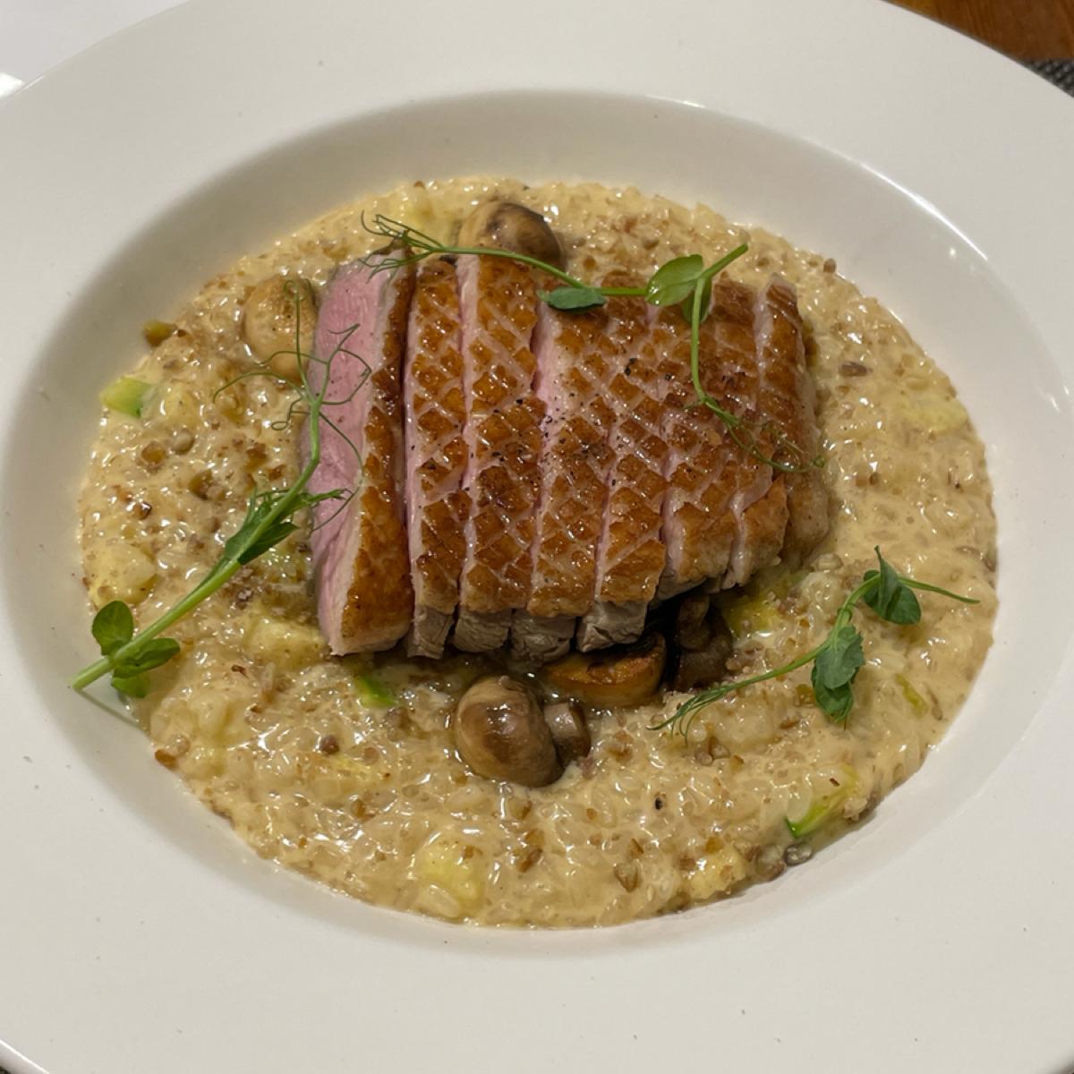 這次點了:奶油栗子燉飯附香煎櫻桃鴨胸,奶油醬汁味道濃郁,鴨胸軟嫩不柴,點餐時服務人員會提醒他們家會有米心、麵心口感需要調整軟一點嗎,我有調整,吃起來我覺得蠻剛好的,份量雖然看起來不多,但我覺得蠻足夠,口味部分我蠻喜歡。