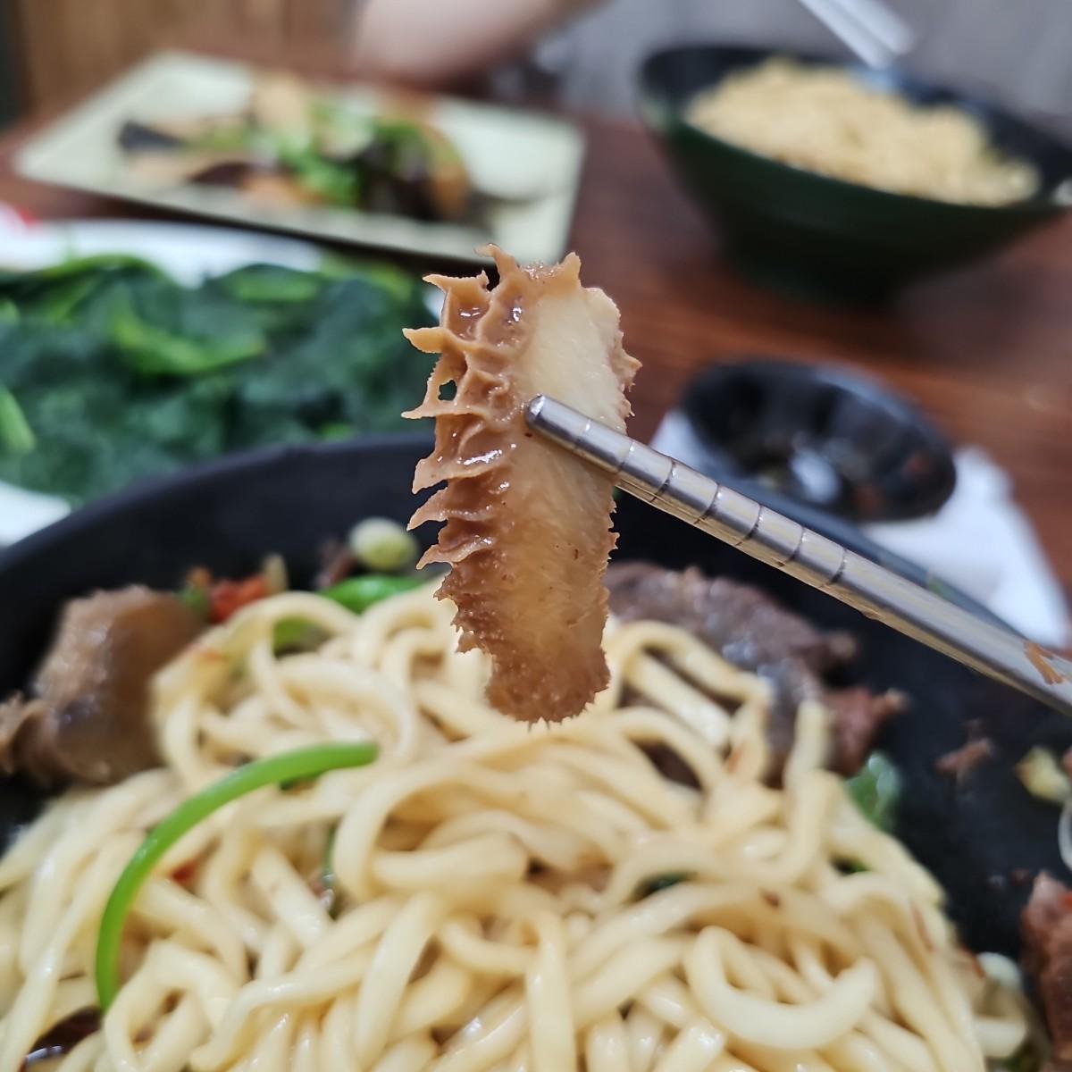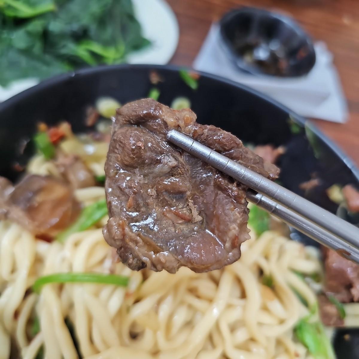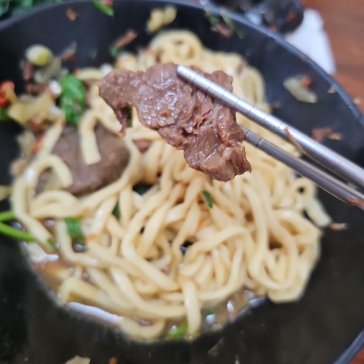 本店的麵體有四種可選(請參考菜單),我最愛的是拉麵,Q彈有勁,又不像細麵會吸滿湯汁負擔太大,跟牛腩滷汁、酸菜、手炒辣椒拌在一起,光麵就很好吃了,更別提上面的牛四寶(牛腩、牛腱、牛筋、牛肚)每一樣都滷的入味軟嫩,還只賣100加麵不用錢,只能說太爽啦