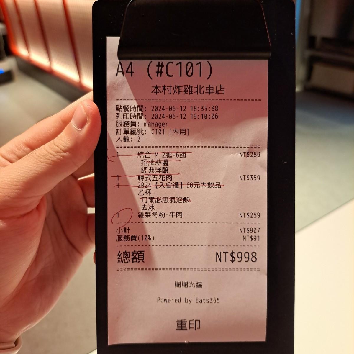 這次共點了一份COMBO韓式炸雞(2腿6翅)、一份韓式烤豬五花,原本以為已經夠吃了,後來炸雞上桌後覺得可能不太夠,又加點了一份牛肉雜菜冬粉,兩人總共花了快千元,幸好台大員工一樣有微風打折,還能減免掉服務費。