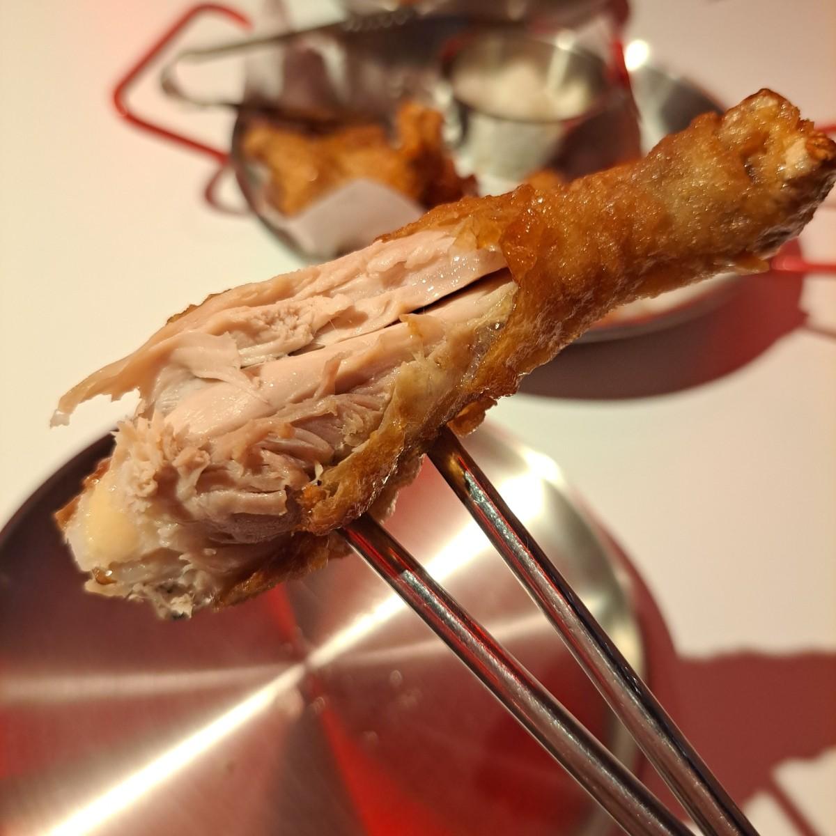 韓式炸雞的部分,雞腿並不是特別大根,雞翅則是兩節翅剪成一半算一翅,因此所謂6翅其實就是3個兩節翅的份量,並不是太多,恰好適合兩人分享。口味上選了一半蒜醬一半洋釀,很神奇的是即使蒜醬蒜味濃厚,平時不能咬到蔥蒜的女友還是覺得很好吃,對我而言風味很像可樂果,但香氣更突出一些,的確是不曾吃過的醬汁口味,而洋釀則是經典的韓式甜辣口味,但比起大部分韓式炸雞來說層次更豐富不死甜,刷在炸雞上有夠作弊,非常好吃!不過雖說醬汁已經很讓人驚豔,真正的VIP還是他們獨特的炸雞手法,那種皮酥的方式外面真沒吃過,完全可以理解被紐約當炸雞黃金標準的理由,然後實際上我覺得雞翅的部分又比雞腿好吃很多,涮嘴😆旁邊附有醃漬白蘿蔔,是給你解膩且可以無限續的清爽小菜。