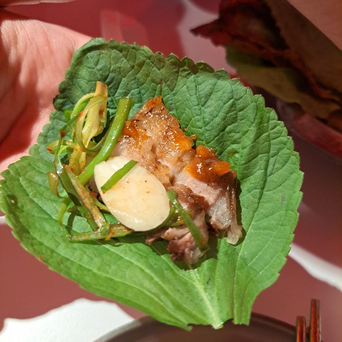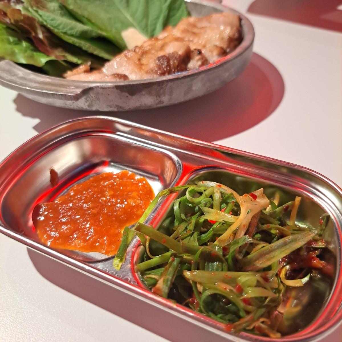 韓式烤五花肉部分,有附上幾片包肉生菜,也有配料小盤,分別是特製辣醬和辣蔥絲,配料部分也是可以續的。肉本身烤的挺好,邊緣有點酥酥的,但整體仍是軟嫩,單獨吃能品嚐到比較明顯的肉香油香,,而包肉用的葉子本身有一股淡淡的清香,不太確定是紫蘇葉還是什麼,夾入生蒜片、辣醬、蔥絲,口感跟味道都很豐富,又是另一種體驗,也是適合多人一起享用的餐點。