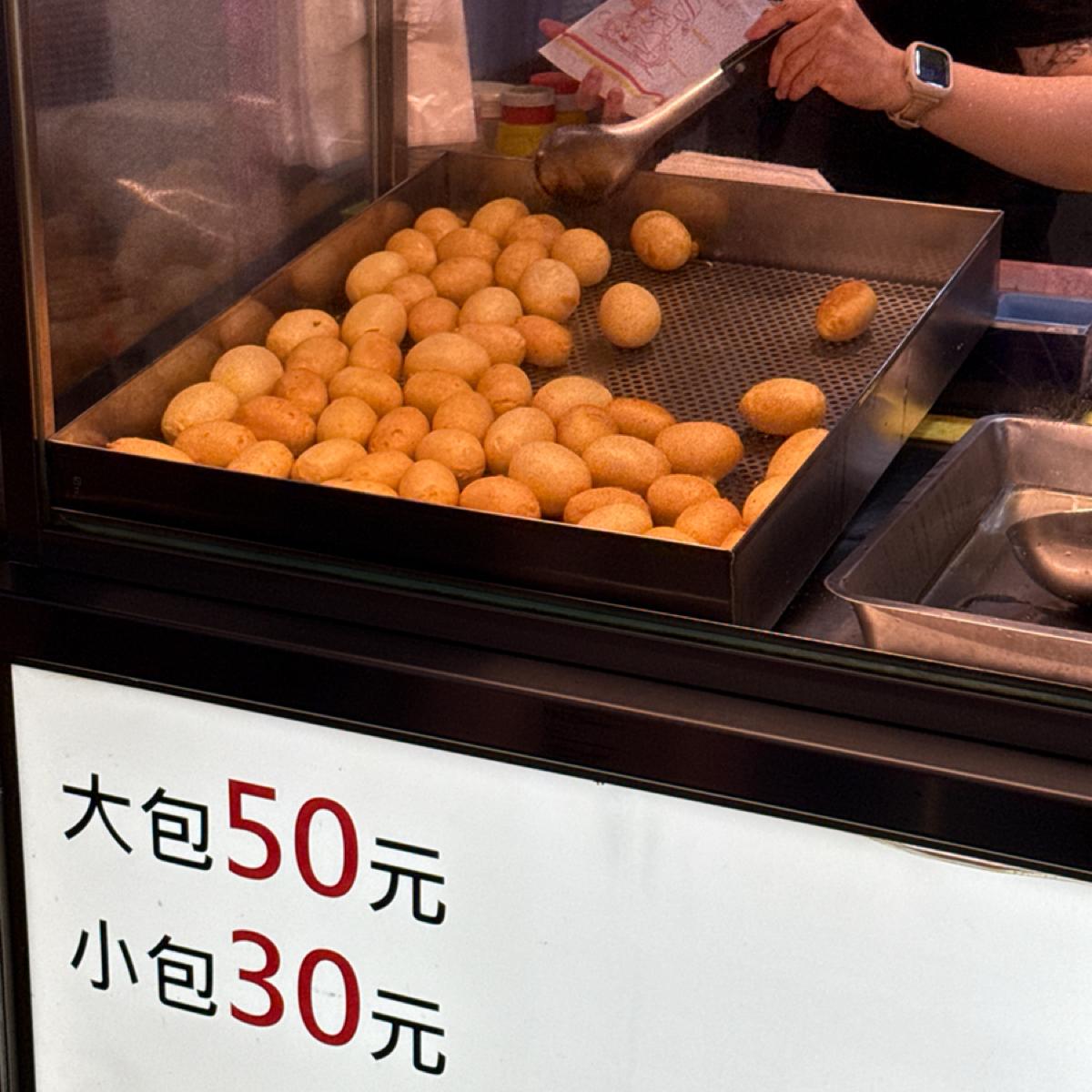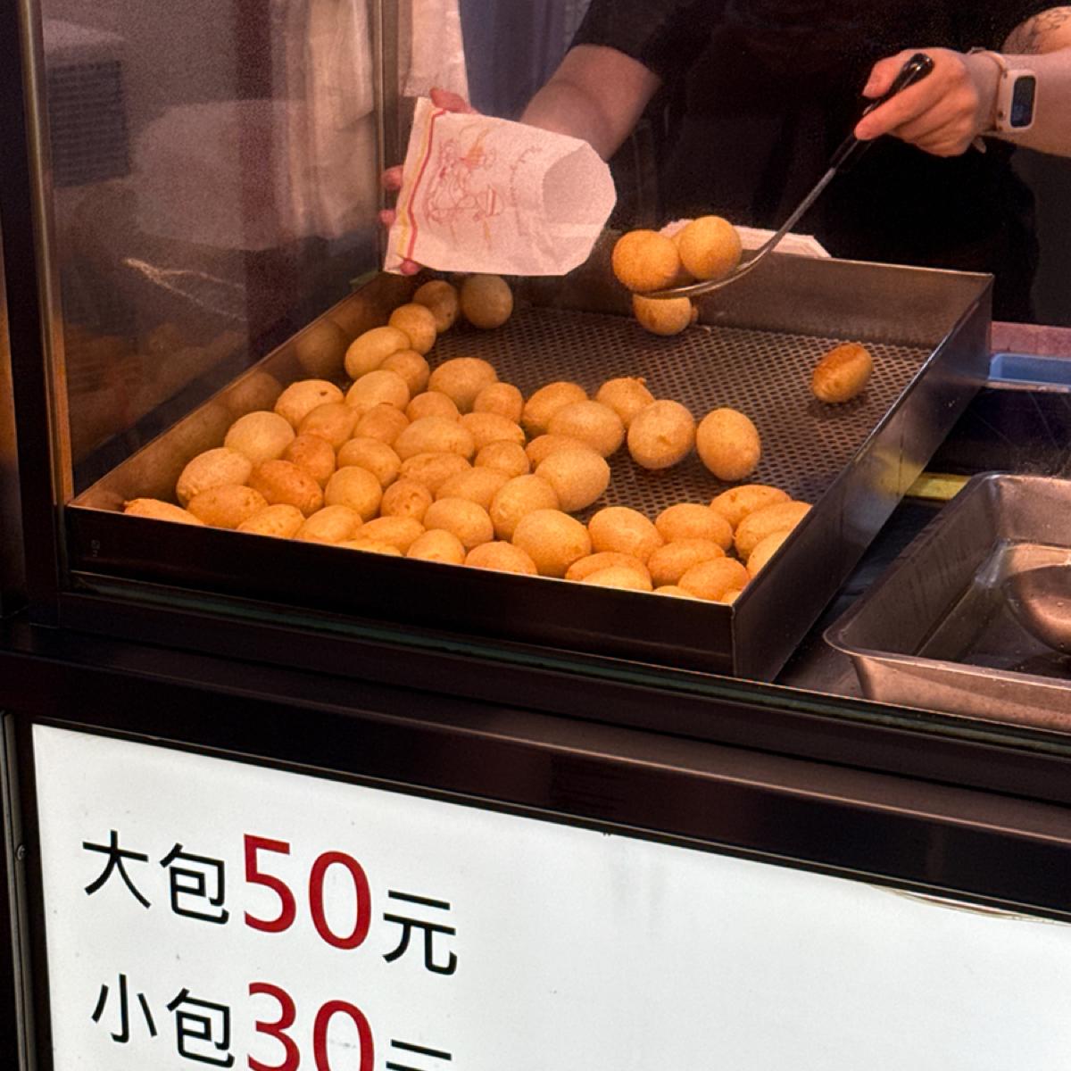 芃豐的地瓜球與一般夜市常見的小顆版本不同,這裡的地瓜球尺寸特別大顆,每顆都像是迷你乒乓球的兩倍大,看起來圓潤飽滿,份量實在。點上一份,袋子裡沉甸甸的重量,讓人覺得相當有誠意~