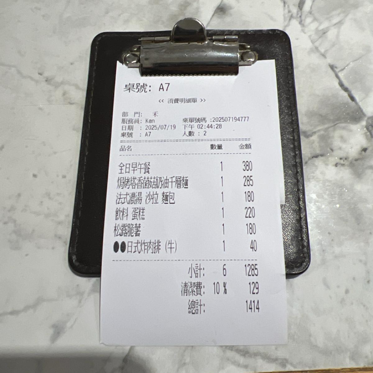 -炒蛋很嫩,味道剛好不會太油,吐司厚厚一片,口感軟綿,單吃就蠻香的。炸牛排看起來蠻厲害,但吃起來就是正常水準,但個人覺得偏油一些,吃到後面會有點膩。旁邊的優格配堅果還不錯,底部是黑糖,但很難攪拌。