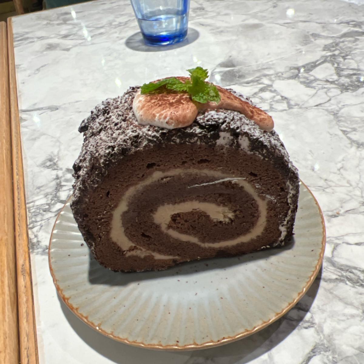 -甜點是可可烏龍生乳捲,蛋糕體濕潤,茶香和可可味搭在一起剛剛好,不會太甜。