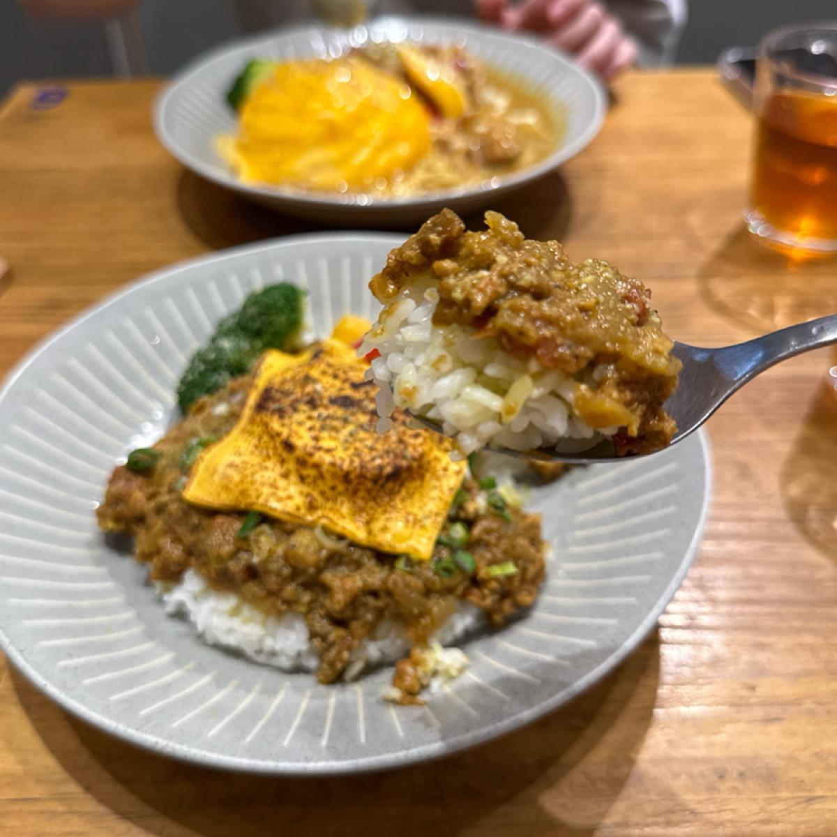 香氣濃郁的選擇。乾咖哩的特色在於少了醬汁的濕潤感,強調肉醬本身的風味濃度。豬肉味稍重,對某些人來說可能需要搭配茶或歐姆蛋中和味道,但我認為這也是它的特色之一,起司的加入恰好增加滑順口感,整體層次不錯,只是可能比較適合口味偏重的人🍛