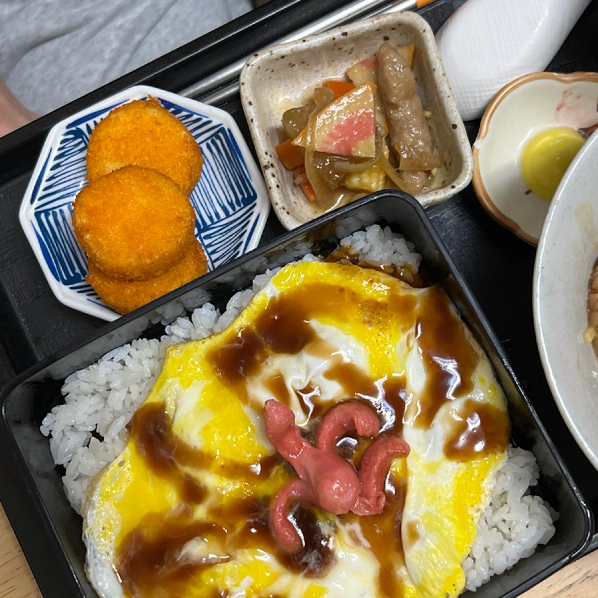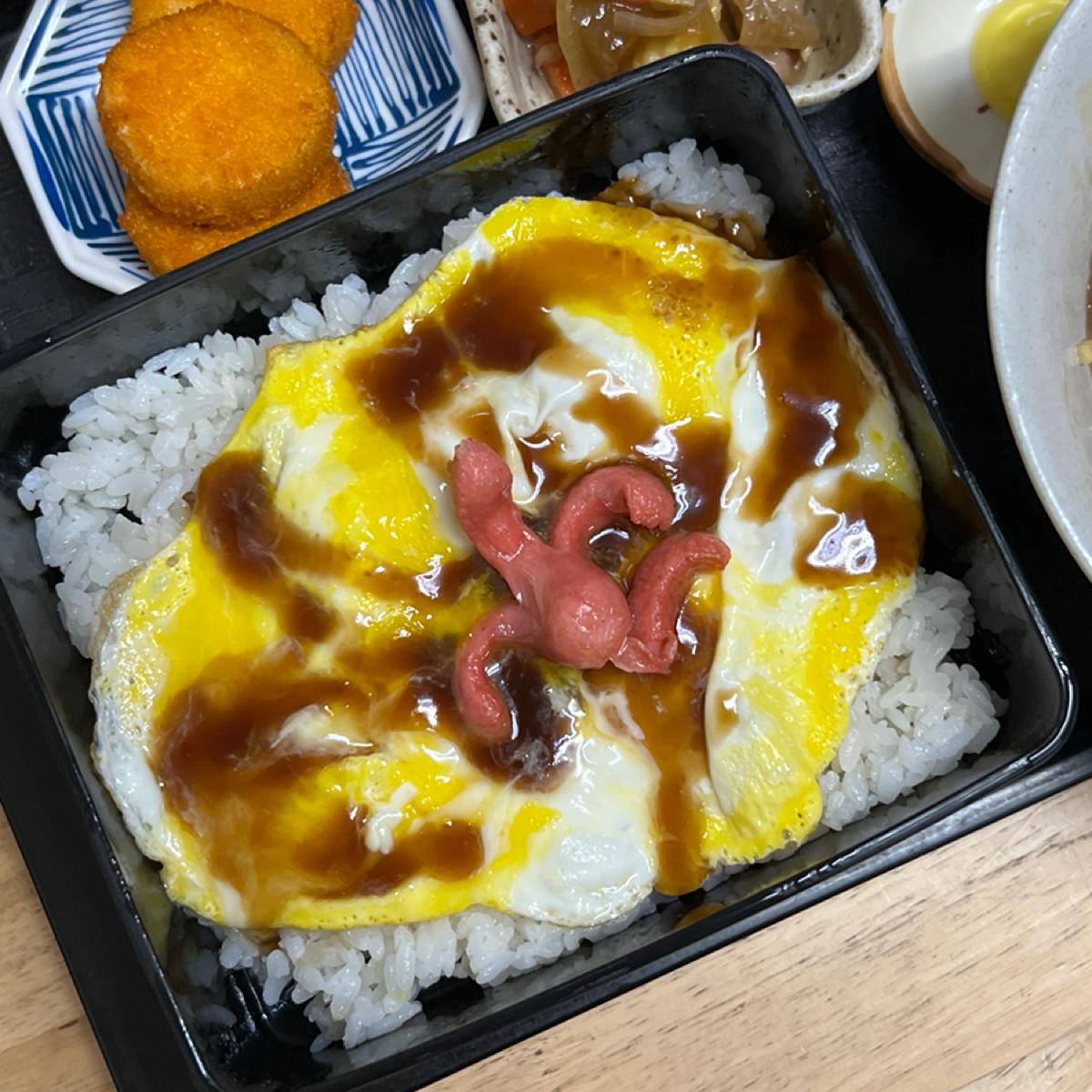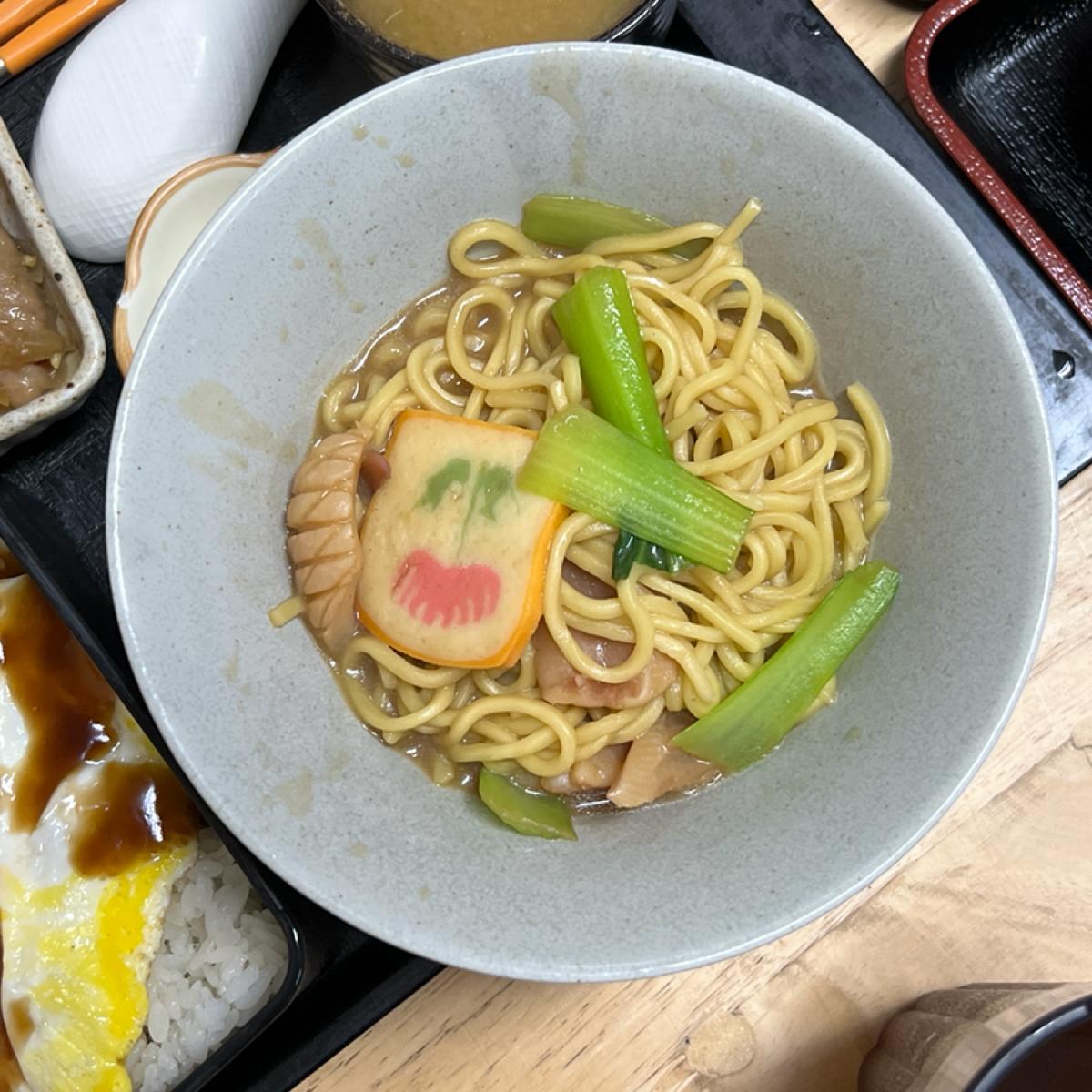 吃粗飽組合有一個炒麵和一個飯盒,飯上面有一顆蛋和鑫鑫腸