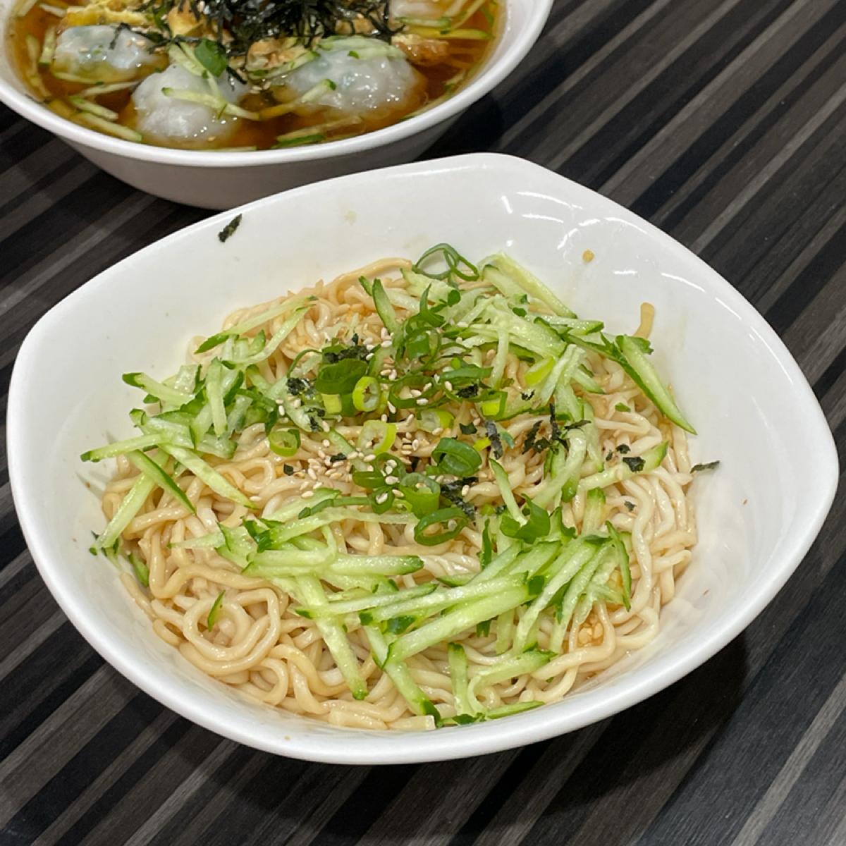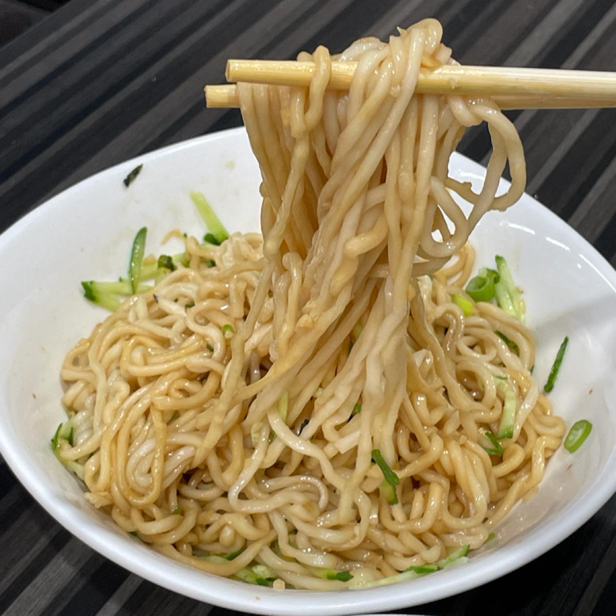 不要小看這碗不起眼的外表,在小黃瓜與蔥末的下面,有著大量滿滿的蒜末,麵條拌開後蒜香十足,一入口那麵條是充滿Q彈嚼勁。一整碗麵的份量很多,單吃一份可能會偏膩。