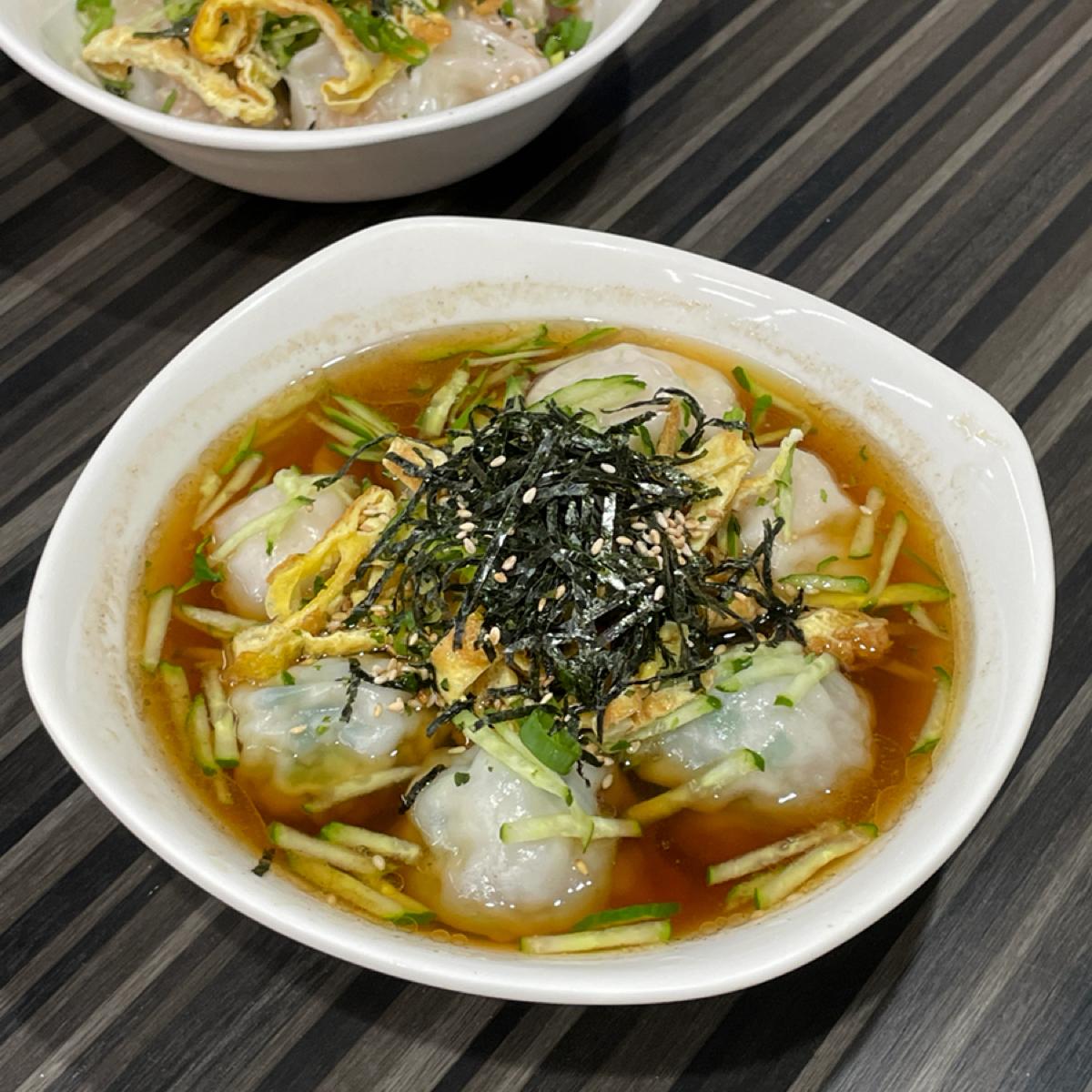 你以為是乾的嗎?並沒有!是有湯泡在裡面的水餃!湯汁帶有酸酸的醋香味,上面灑滿蛋絲、海苔、芝麻跟小黃瓜絲。共有 8 顆,分別是4 顆韭菜,4 顆高麗菜。