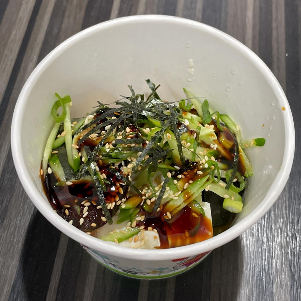 (這道是隱藏菜單) 上面鋪滿小黃瓜絲跟海苔讓我快看不到皮蛋豆腐,整體中規中取。用紙碗裝有點不環保且比較難夾稍嫌可惜。以小菜來說這樣價位也偏高。