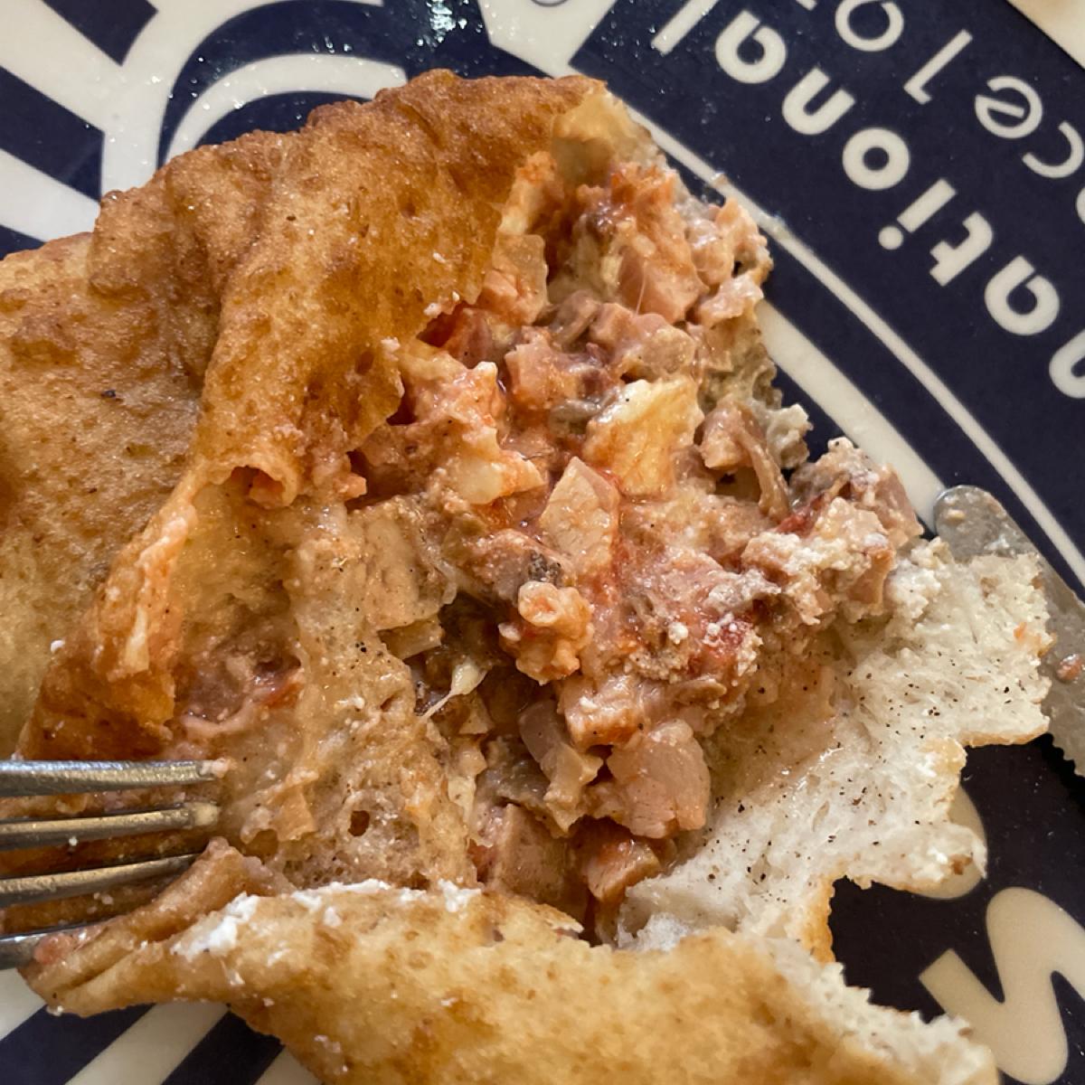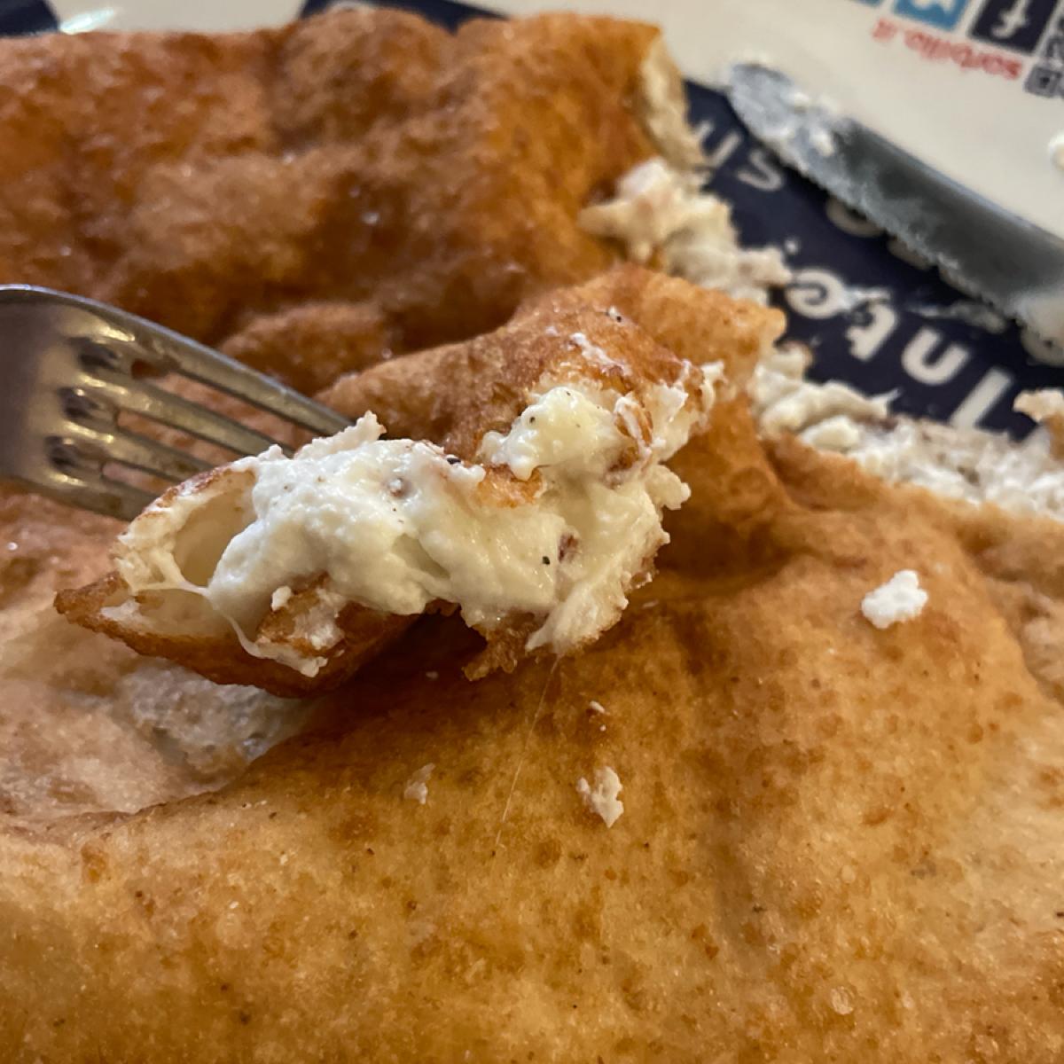 炸披薩上桌時我們有傻眼,先給了我們一個空盤子,然後將一大塊炸披薩從紙袋中倒出來,真的是「一大塊」,一開始切來吃時以為是沒有餡料的,有點像台灣炸蔥油餅都口感和味道,後來發現其實有包起司和疑似醃培根的東西,我覺得是好吃的,但炸披薩放久了餅皮會變得有點韌不是很好咬就是了