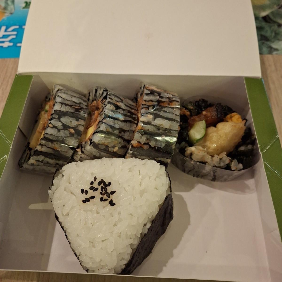 老實說他們的餐點不符合我的口味,紫蘇梅特有的香氣是我不太喜歡的味道,然而飯糰除了紫蘇梅子以外幾乎沒有什麼調味;花壽司裡面包著炸蝦跟豬肉等等一般壽司不太會包的東西,很新奇,但也僅止於很新奇,至少對我而言是這樣。