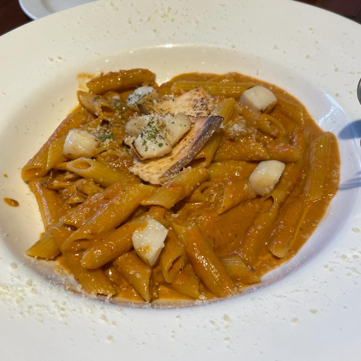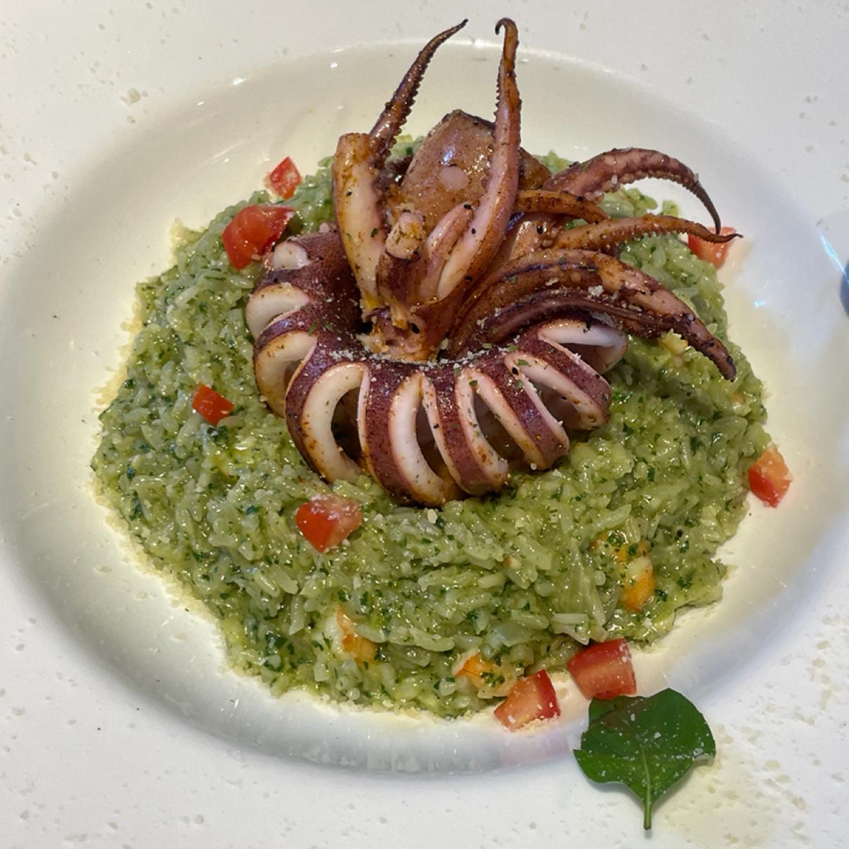 奶油番茄鮮干貝煙燻鮭魚筆管麵,吃起來醬汁濃郁,義大利麵熟度也ok,還點了不在菜單裡今日特餐青醬墨魚燉飯,青醬比較不是我的菜,但墨魚感覺是新鮮的。