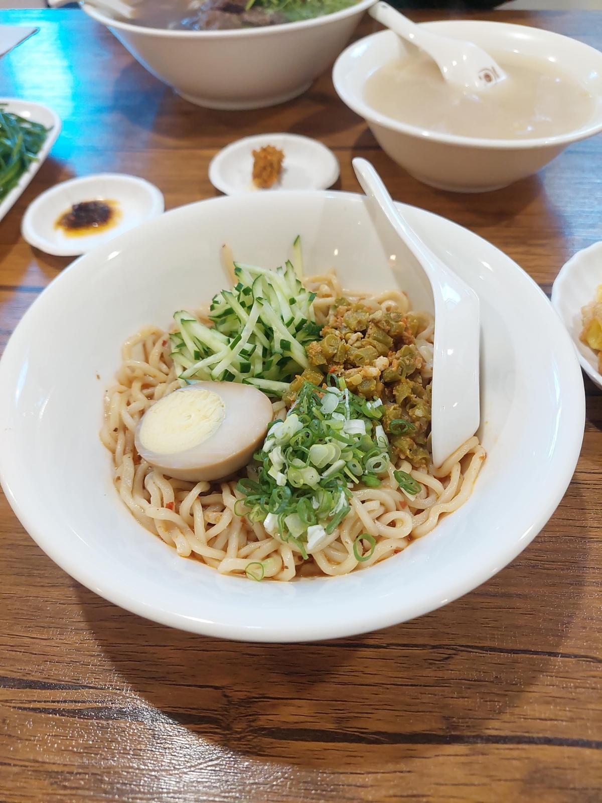 同樣是Q彈的細拉麵,添加了蔥、小黃瓜跟麻辣酸豆。