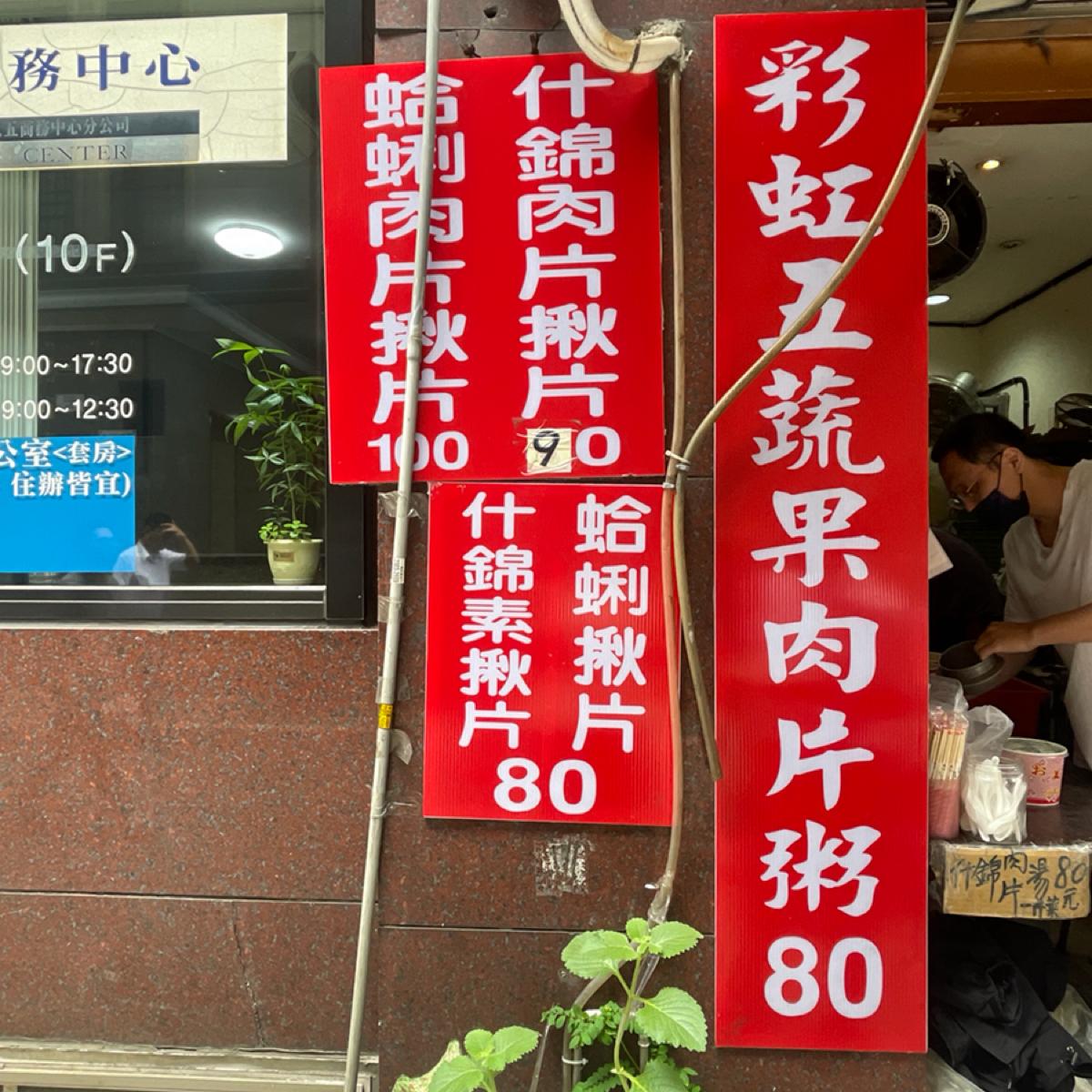 沒有紙本菜單,賣的品項直接貼在牆上,包含彩虹五蔬果肉片粥、什錦肉片揪片、蛤蜊肉片揪片等